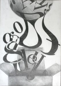鈴木君の鉛筆描写です。他の学生とは違った世界観です。アルファベットを平面構成的な表現で描き、画面に力強さが出ています。