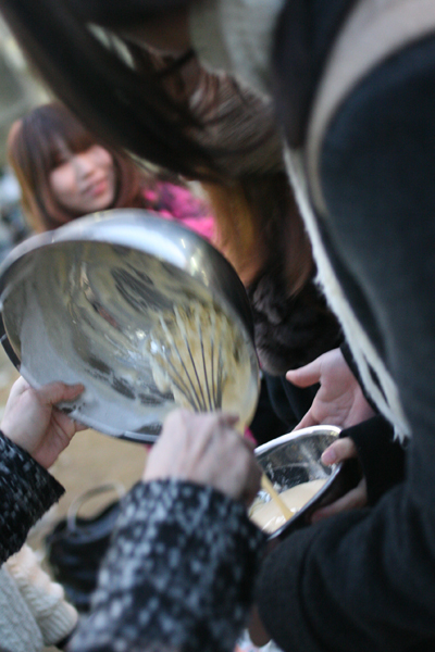 イラストレーションデザインコースの学生もたくさん参加してくれました。みなさんバウムクーヘンを焼くのは初めてです。なれない手つきながら日頃のチームワークを発揮して会話を楽しみながら作りました。