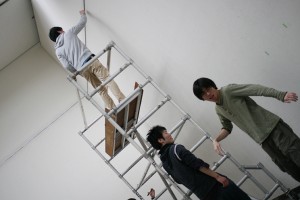 デジタルメディアデザインコースの学生が照明器具の設置に応援に来てくれました。学生とは思えない仕事ぶりです。普段のチームワークの良さを発揮していました。とても頼りになります。