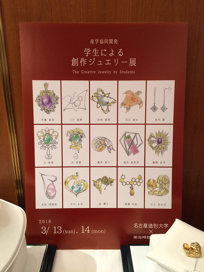 ここでは名古屋造形大学と株式会社栄光時計との産学協同による”学生による創作ジュエリー展”が開催されている。