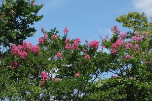 いつも紹介する百日紅(サルスベリ)。これはピンクの種。向かって右隣はフジ色だ。