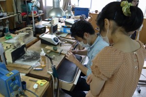 ジュエリーデザインコースでは「公開プレゼン・体験 “シルバーリング制作”」が進行中。先輩が熟練の技を見せてくれる。