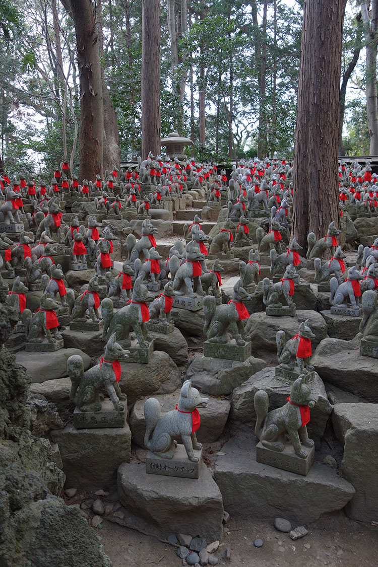 霊狐塚には1,000体以上の狐の石像が安置されている。ちなみに、なぜ赤い前掛けをしているのか?