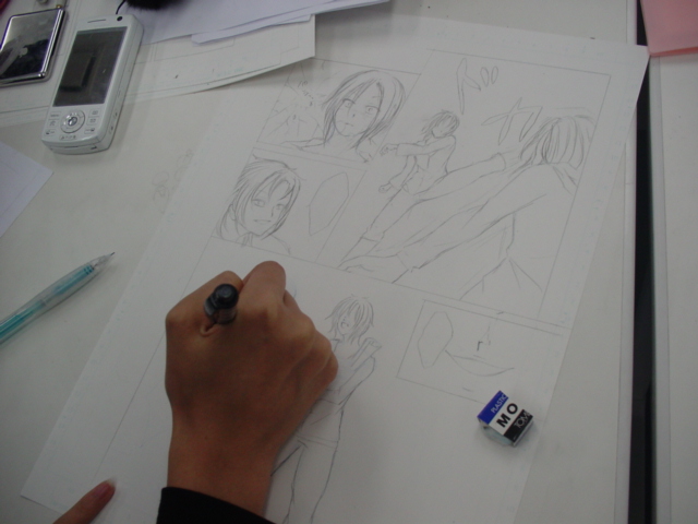 1年生は高木先生による「背景/コマ割り」演習として、本学キャンパスを舞台に2p以上のマンガを描くという課題が進行中です。これはあらかじめカメラで撮ってきたキャンパスの様々な場所を背景としてマンガに取り入れ、ストーリーは無くていいから演出の流れを重視する、というユニークな授業です。
