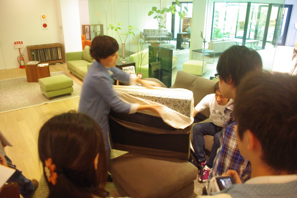 今回のshowroom見学では多くの学生が持っている”ソファーって?”といった疑問を百聞は一見に如かずと言うようにまずは見て、触って、体験してソファーに対する疑問質問を解決する見学会として提案されました。
