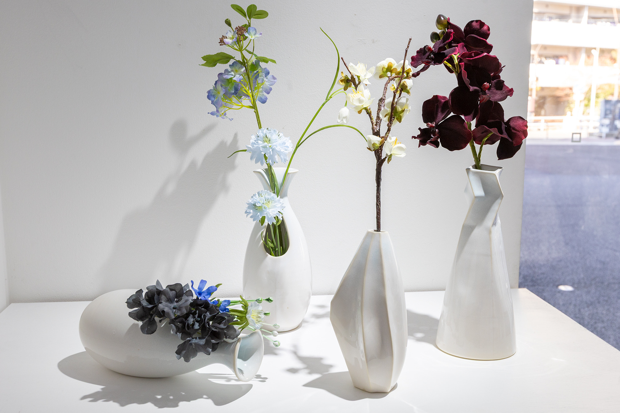 最初の授業で、テーマ発表を行った時は「『自然と共に暮らす』木の灰を釉薬にした陶器のブランディング」という内容で、これまでの創作活動の中で陶器に対する相性が良かったのか、「釉薬」にフォーカスした製品作りを当初から想定していた。この時点で自身の生まれ故郷である「安曇野」の自然と向き合うこともイメージしており、安曇野由来の木の灰を釉薬に使う構想がメインテーマと受け止めた。着手したプロセスも、テストピースを作り色々な木の灰と長石の配合比を変え焼成しては色合いや流動性、表現の違いを観察する研究色の濃いスタートとなった。誰しも生まれ育った土地に対する想いは深いが、当初、ブランディングの対象として『安曇野』に決めることに不安を感じている様子だった。話すうちに本人が取り組みたい内容の優先順位の一番がブランディングであることから、一旦テーマを『安曇野』で仮決めし、並行して釉薬の検討をすることとした。アイテムについては、食器、花器、ランプシェードなど5種類を検討し、「安曇野」の解釈を意識しながら、アイデアスケッチに入ったが、ブランディングまでやりたいとのことだったので、考え方…核になる要素、特徴などを並行して考える必要があった。最初の造形…後の「晧」(こう)となる基本形状が見え始めた頃、見た目で安曇野と分かる必要はあるか…との相談を受けたが、作者がインスピレーションを得て解釈したもので良い、見た目で分かる具象性よりも作者の感性というフィルターを通した物作りで良いと回答した。…と言うのも、その非対称なカタチには妙な魅力があり、山の稜線を思わせる独特の3次元的なエッジによって、美しい印影と見る角度によって表情を変えるユニークな佇まいを持っており、荒削りではあったが彼女の造形センスを充分に感じさせる立体と感じたからだと思う。彼女の中では、山の稜線と白鳥のシルエットという具体的なモチーフがあったようだが、丁度良いさじ加減で抽象化されていることが良かったと思う。この彼女の造形センスは2つ目の「澄」(すみ)にも3つ目の「岑」(しん)にも発揮され、それぞれに異なる表情を見せる造形には素直に美しさを感じることができた。ただし、形状の複雑さ故に鋳込み型を作るための工程には苦労したようだ。3次元的なパーティングラインの設定や割型の数と向きなど、これまでの陶芸の経験とは異なる考えやプロセスが求められ、ものによってはメス型を鋳型するための型を3Dプリンターで作るなど、チャレンジングな取り組みにも挑み、きちんとモノにした点も素晴らしかった。一方、最終的に木の灰を使う釉薬の研究としては、信州檜灰など素材については安曇野由来に拘った方が良いと思いながらも、期待する表現に繋がらないという結論を導くことになりはしたが、このプロセスこそが研究であり大切な時間だった。しかしながら、それぞれにユニークな3つの形状をひとつのブランドイメージに関連付けたのも釉薬だった。白をベースに仄かに澄んだ青みを感じさせる釉薬を霧吹きで吹く工程から生まれた優しいグラデーションは、造形のテーマとなった「雪山を背景に湖に飛来する白鳥」にも「雪を被る険しい峰」にも「濁りの無い清らかな水」にも…全てにマッチする絶妙な美しさを表現することに成功したと思う。彼女が最もやりたかったブランディングについても、ブランド名やロゴの設定を含め、パッケージやショップバッグなどへの展開を進め、作者がこの1年間大切にしてきた世界観を確かなものとして表現したと思う。ブランディングはグラフィカルなアイデンティティとしての捉え方をする向きもあるが、「Sree」では、何よりも「モノ」が持つ美しさと存在感があっての成果だと思う。