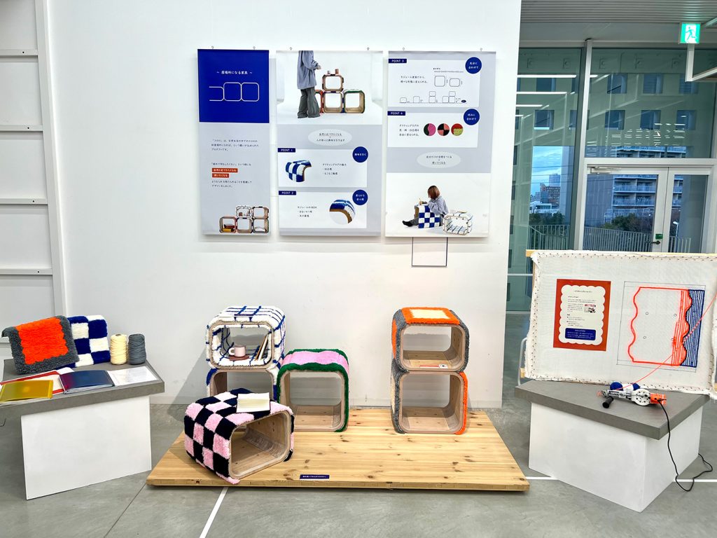 そもそもの彼女のテーマは「たくさんの幸せをつくる家具つくり」というもので、ドミトリーに住む若い人をターゲットにした配置によって空間をカスタマイズできる家具だったと思う。自分の好きな、拘りの持てる部屋をモジュールを交換することで(ある意味)大掛かりに模様替えできる構想で、ライフスタイルや人生のタイミングに沿って、一緒に変化/成長するようなイメージと理解していた。初期段階では、ファーニッシュドの賃貸アパートが提供する家具とそれらに装着する加飾パネルビジネスのようなアイデアがあり、提供できる世界観のバリエーションとIDとしてのモジュール構造の検討をしていた。話していると空間と家具の新たな関係性を作りたいことは伝わってくる。カスタマイズできるモジュール式の家具と自由に壁面にレイアウトできる仕掛けを備えた壁を持つ部屋なども検討したが、本人としては決め手に欠ける様子。有孔ボードは現在、S字フックを付け道具や帽子を掛けるアイデアは散見するが、もう少し大がかりなものまで想定し、棚や家具、テーブルなどにもなり得るパーツ展開を考えてみる。壁面中心の…模様替えが簡単で、棚や机の天板を好きな高さや場所にカスタマイズして、お気に入りの空間を実現する構想もあった。強度的な問題や取り付け構造など解決案が必要な部分はプロダクトとして検討しよう…北欧のヒュッゲなどの概念を引き合いに、お気に入りの自由な空間の意義を改めて確認しよう…と、かなり進んだ時点で、この「壁面にモジュール化された机や棚のユニットを装着するアイデア」で進んでいた。…が、後期に入り「居場所になる家具」というキーワードに辿り着き、最終案のキューブ型のパイルアップするモジュールに方向性が決まるまで思ったよりも難航した。タフティングはキューブの表面をカスタマイズする加飾材として日の目を見ることになった。いつも自らノートを持って相談に来る彼女とのやり取りは2転3転する大変さはあったが、振り返るだけで懐かしく楽しい…(本人は)苦しい時間だったに違いないが…😌 タフティングを使うことを決めた時、従来のラグのような2次元的なものでは無く立体感のある造形や、使用する毛糸の太さを変えるなど、タフティングの新たな一面を引き出して欲しいと思ったが、キューブに巻き付いたことで、ある意味それは実現した。