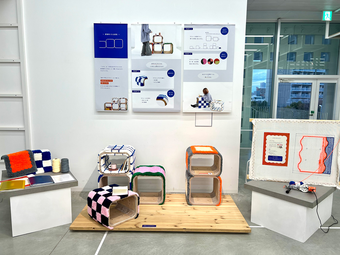 本番用のモデルの着手が遅かった点は否めない。コーナーRの大きな四角い筒を合板で作るために、たくさんのコーナーRの形状を切り抜き積層したが、同じ工程を繰り返す中で、自ら3Dプリンターで治具を作り、精度良く効率的に積層できる方法自体を考案したのは良いアイデアだった。数を作る必要から時間との戦いになり、一時は目標数よりもクオリティーを上げることも考えたようだが、最終的にはクオリティーも数も諦めること無くやり遂げたことも良かった。完成した6個のキューブは、シンプルな造形だがタフティングによるビビッドな存在感が与えられ、「居場所になる家具」という不思議なコンセプトは分かりやすい表現になったのではないかと思う。