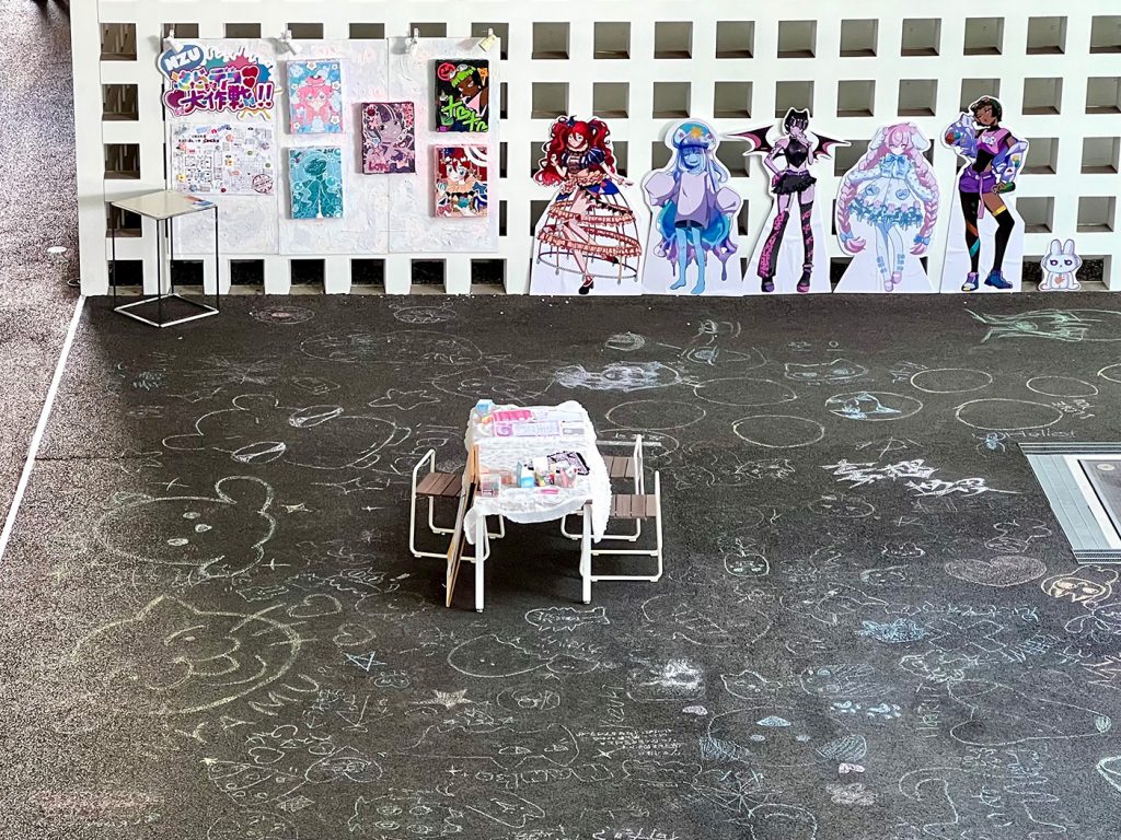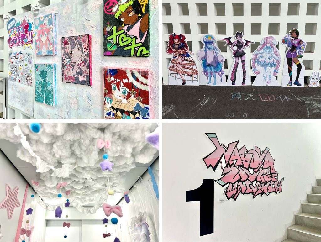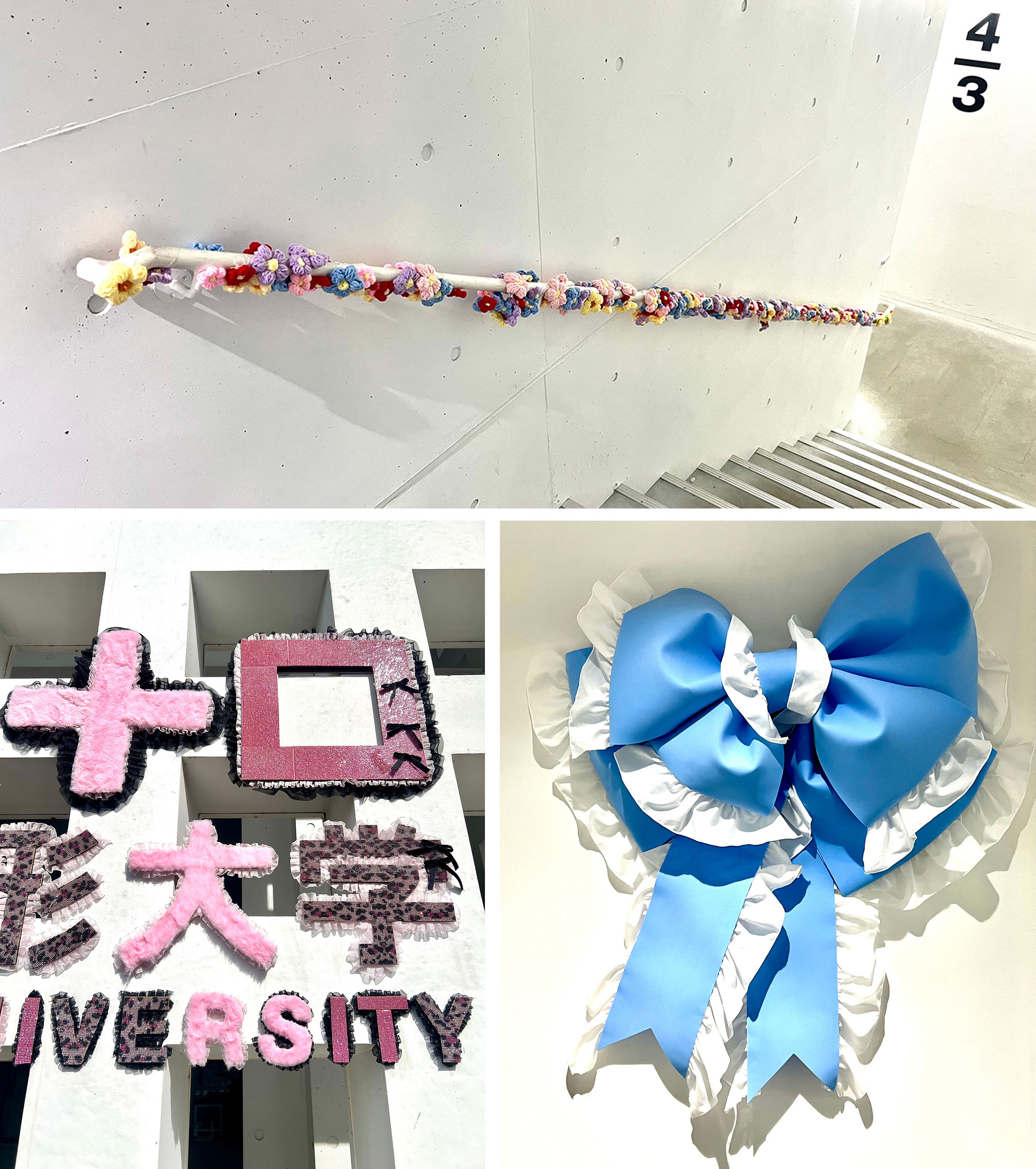 キャラクターデザインでは、5つのキャラクターのファッションテーマを設定することとし、大学構内をロケハンした写真に切り貼りして、構内での展示イメージを確認することも必要な工程だった。メインの展示となるアートストリートでは、アスファルトの上にみんなでチョークで落書きをする参加型コンテンツも計画し、本来、使用基準で縛られがちな「大学のロゴマーク(〇=△+□)」にも装飾を加えることにした。最終審査の後、領域内のミーティングの中で学長も苦笑いしながら「やるなら徹底的にやってください」と励ましのコメントも貰った。最初に、「自己表現の最大値に挑戦」と書かれた資料には、A1パネル3枚と小パネル数枚…という記載があったが、結果的にはそれらを遙かに上回る物量…1800 x 750 の机が6脚繋がったスペースに山積みになったパーツやパネルを作り、学内を飾ってくれた。ここに彼女の論文を掲載することはできないが、その中には建築に対する敬意やクリエイターとして守るべき矜持などが綴られている。彼女は言葉巧みに喋ることが得意な訳では無く、表現がファンシーな世界観故に軽佻に見られがちだが、実にしっかりした考えを持ちこの作品に向き合ってきたかを知ることができる。この作品はスタジオの責任においての原状復帰が条件なので、展示終了後にアスファルトに描かれた落書きを彼女と一緒にデッキブラシでキレイにするのが楽しみだ。