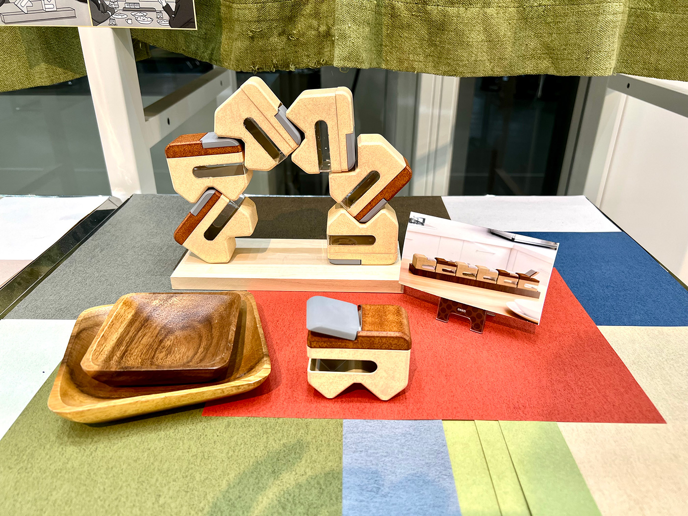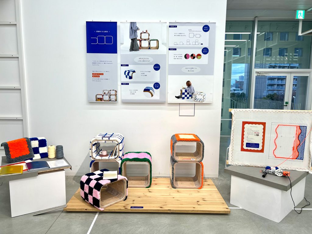 そもそもの彼女のテーマは「たくさんの幸せをつくる家具つくり」というもので、ドミトリーに住む若い人をターゲットにした配置によって空間をカスタマイズできる家具だったと思う。自分の好きな、拘りの持てる部屋をモジュールを交換することで(ある意味)大掛かりに模様替えできる構想で、ライフスタイルや人生のタイミングに沿って、一緒に変化/成長するようなイメージと理解していた。初期段階では、ファーニッシュドの賃貸アパートが提供する家具とそれらに装着する加飾パネルビジネスのようなアイデアがあり、提供できる世界観のバリエーションとIDとしてのモジュール構造の検討をしていた。話していると空間と家具の新たな関係性を作りたいことは伝わってくる。カスタマイズできるモジュール式の家具と自由に壁面にレイアウトできる仕掛けを備えた壁を持つ部屋なども検討したが、本人としては決め手に欠ける様子。有孔ボードは現在、S字フックを付け道具や帽子を掛けるアイデアは散見するが、もう少し大がかりなものまで想定し、棚や家具、テーブルなどにもなり得るパーツ展開を考えてみる。壁面中心の…模様替えが簡単で、棚や机の天板を好きな高さや場所にカスタマイズして、お気に入りの空間を実現する構想もあった。強度的な問題や取り付け構造など解決案が必要な部分はプロダクトとして検討しよう…北欧のヒュッゲなどの概念を引き合いに、お気に入りの自由な空間の意義を改めて確認しよう…と、かなり進んだ時点で、この「壁面にモジュール化された机や棚のユニットを装着するアイデア」で進んでいた。…が、後期に入り「居場所になる家具」というキーワードに辿り着き、最終案のキューブ型のパイルアップするモジュールに方向性が決まるまで思ったよりも難航した。タフティングはキューブの表面をカスタマイズする加飾材として日の目を見ることになった。いつも自らノートを持って相談に来る彼女とのやり取りは2転3転する大変さはあったが、振り返るだけで懐かしく楽しい…(本人は)苦しい時間だったに違いないが…😌 タフティングを使うことを決めた時、従来のラグのような2次元的なものでは無く立体感のある造形や、使用する毛糸の太さを変えるなど、タフティングの新たな一面を引き出して欲しいと思ったが、キューブに巻き付いたことで、ある意味それは実現した。