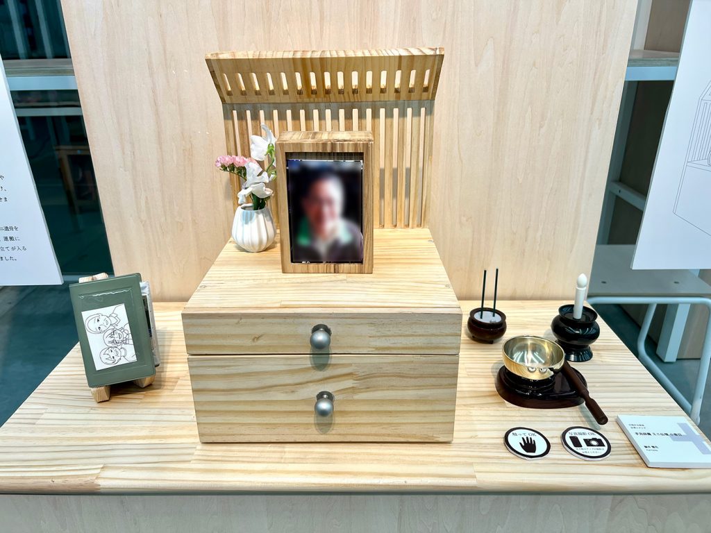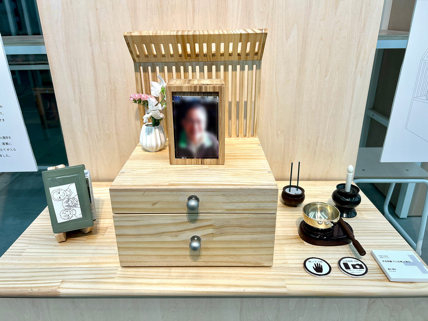 彼女もまた、独特の世界観…というかリズムのようなものを持っている。葬儀を扱う会社でのアルバイト経験を持ち、「死」と向き合う人達を人一倍目の当たりにしてきたことや、それを自分事のように感情移入することができるキャラクターだったことも、その一要因ではないかと思う。「最後の旅路を見送る 人に寄り添うメモリアル」というテーマは、長い歴史の中でフォーマルかどうかは問わず様々なアイデアが試されてきたに違いない。従来の仏壇の持つサイズ感や様式美が、マンション暮らしなど今の時代の生活スタイルにマッチしないニーズから既にコンパクトでモダンな様々な仏壇のカタチが数多く商品化されている。写真、燭台、線香立て、お綸、花器などの最小限のアイテムを新たにディスプレーしてみせる商品はお洒落な空間にも合いそうだ。彼女のアイデアには、遺灰を釉薬に混ぜた陶器による花器など、故人の物理的な遺物をカタチにして残すものもあった。遺灰に含まれる炭素から人工ダイアモンドを精製しアクセサリーにするサービスも既にある。私ががUXとして興味を感じたアイデアは、火葬場での待ち時間にそこに集まった人達で最後に故人を見送るためのワークショップ(例えば寄せ書きや動画のメッセージなど、集まった人の記録)を企画し、その成果を故人の写真立てなどに収納するというものだった。遺灰を使った花器やアクセサリーのような…大掛かりで、所有する人と故人が1対1の関係性を作るものでは無く、その場に集まった人達の痕跡が故人を囲むかのような図式に面白さを感じた。彼女はそのアルバイト経験から、大切な人との別れがあっけなく終わることに物足りなさを感じ、遺族の気持ちに想いを馳せ、火葬場での待ち時間という手持ち無沙汰の間合いに、葬儀とは異なる近い距離/身内だけの大切な時間をイベント化するアイデアを持っていた。待ち時間にしみじみと故人の話に花を咲かせるのも良いが、カタチに残る何かを作る共同作業を通して最後のひとときを記憶に残し、仏壇に供えられた「それ」を見る度にそこに集まった人達や共に過ごした最後の時間を追体験できる機会もまた、遺族にとっての価値となるかもしれないと感じた。提案では、最後に別れを告げたその瞬間の遺族達の思いと手がかりが常に故人に寄り添っている(仏壇を故人だけをまとめた「あちらの世界」としない)カタチに特別な意味があると思われる。伝統的な様式やマナー/タブーといった「祀りモの」に対するルールのようなものもあるかと思うが、コンパクトさ故に仏間や仏壇の中だけに縛られない自由さがあっても良い。最終的には、木工によるシンプルな箱形の造形を基調としたものにまとまったが、機能的な要素が優先されたためか、少し大人しい佇まいに収まってしまったと感じる。燭台、線香立て、お綸、花器などを既成の商品で代用せざるを得ない日程感だったが、これらの周辺パーツも含めたトータルのイメージで捉えることで、一見祭壇には見えないカタチまでアイデアを拡げてみたかった。神聖であり身近でもあり…キーワードフォルム(学生にしか分からない?)としては難しいお題かもしれないが、明快な新しさを提示する方向性でアイデアが広がると良かったと思う。展示においては最後の最後までパネルの配置や論文置きの台まで、少しでも良い状態で見せようとする頑張りは良かった。