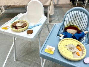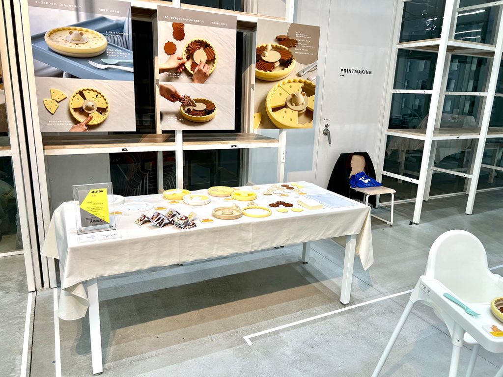 先日、立ち話の中で、入試は学科試験で入った…と聞いた。私の中では総合選抜型専願で見た「箸箱」の作品が記憶の中にあり、てっきりその入試で入ってきたと…4年間ずっと思い込んでいた。聞くと総合型選抜専願を含む数回の試験で落とされ、最後の学科でようやく合格したとのこと。(ナイショにしていたらごめんなさい)何度も受験してくれたことに改めて感謝するが、4年が経ちそんな彼女が卒業制作展では中部デザイン協会賞とJIDAの優秀賞の2冠を持っていったことを考えると感慨も一入だ。その卒業制作も決して順風な滑り出しでは無かった。最初の資料では「無意識…意図せず、つい起きてしまう問題を無意識の行動の流れで解決する」と題され、「ナッジ理論」や「仕掛け学」「心理的バイアス」といった私の大好物な分野であり、私の研究テーマでもある「UXデザイン」にも関連するテーマだった。これらのテーマは、日常の中に些細な事例を見つけ出すことはできるが、卒業制作として取り組むには研究としてのリサーチを中心としながら論文にまとめていくか、プロダクトとしてのターゲットを見据え、理論を応用した解決策を「モノ」にするかによっては、1年間の計画が大きく変わる。彼女は後者を選ぶことになるが、理論を応用したプロダクトの選定に時間が掛かった。仕掛け学の『バスケットゴールのゴミ箱』の事例をもとに『ヒトが無意識に行動するキッカケは何か』は『楽しさ』がポイントであることを共有し、『楽しさ』を洗い出すことの検討も進めた。幾つかのアイデアを出しながらも、必然性や商品としての魅力、ターゲットの曖昧さ…それって本当に楽しいのか?…を考えるうちに思考の渦から抜け出せなくなる迷走期間が暫く続いた。例えば、トイレットペーパーの芯を捨てる際に、筒形状を指定のカタチに変形させないと収まらないトラッシュボックスというアイデアで上手く捨てられるとストックが充填されるアイデアを模索する日が続いた。日常の何気ない作業にゲーム性を持たせるゲーミフィケーション的な発想自体はユニークだったが、コンスタントに毎回楽しみながら継続できるかどうかについては微妙だった。コンセプトイメージ展も近付いた7月に入りようやく親子関係をテーマに子供が楽しみながら食事ができる食器の構想に辿り着いた。ただし最終案に行く着くにはまだ暫く時間が掛かり、陶芸室で葉っぱの形の皿を焼いたこともある。後期に入り最終案の原案に近いモノが見え始めてから彼女の夥しい量の試作作りが始まった。中でもプラネタリーギアを用いて回転させるタイプでは、摺動性を確保しながら子供の軽い力で回すことができ、見た目があまり機械的にならないようなギアの歯数や深さ、キッズデザインとしての丸みのある造形を探り当てるまでのプロセスは、仮説を立てては作ってみることの繰り返しで研究としても面白かった。歯車の形状がクッキーに見えたり、スライド式の扉がチーズに見える…などの発想から彼女のユニークな世界観が広がり始めたようだ。クッキーは裏表で色々なパターンを楽しむことができたり、チーズの表面に空いた穴は数字の遊びに繋がるなど、思い付く限りのアイデアを落とし込むことができた。子供とのインターフェースとしてネズミとリスのキャラクターを作り、構造的なストッパーとしたり、ベースになる器はキャリーオーバーしながらバリエーション展開を図るなど、プロダクトとしての要素にも配慮した。3Dプリンターの制約上、器の底の角Rが大きく取れないことにも彼女は不満があり、手作業のサンディングで仕上げる工程も含め、最後の最後まで試作の繰り返しを続けた取り組みはとても良かったと思う。机の上にできた試作の山は、彼女の戦利品でもある。