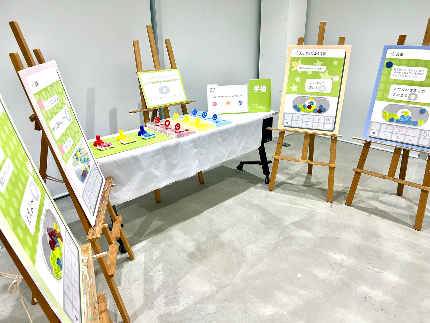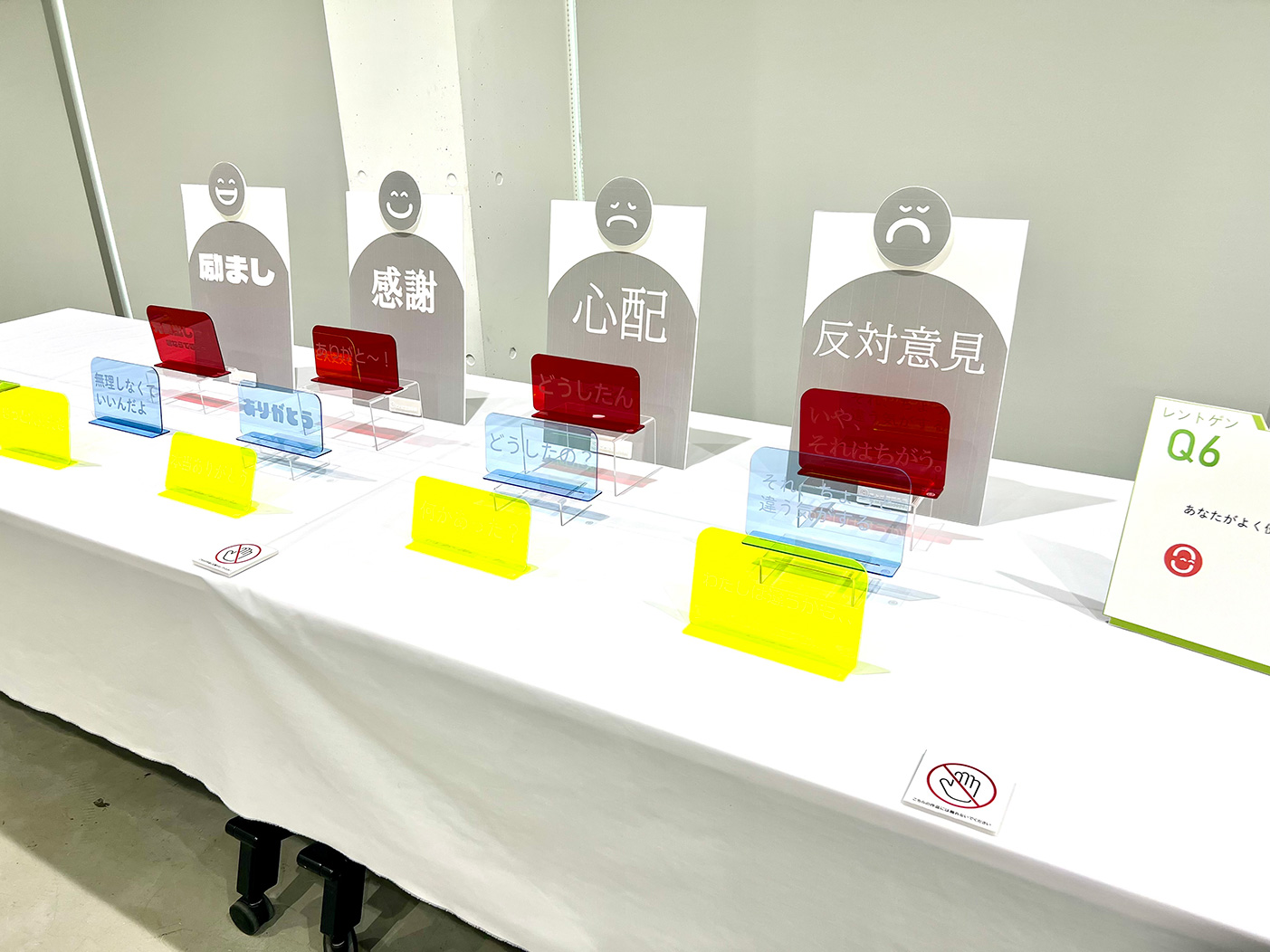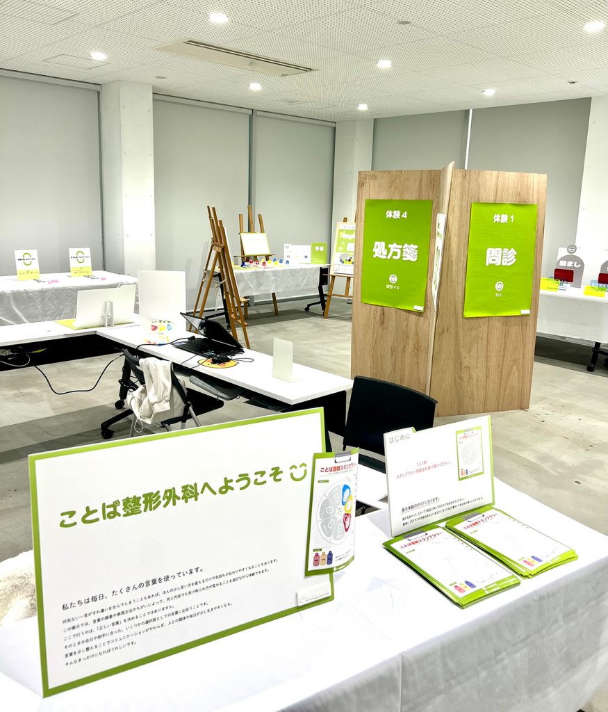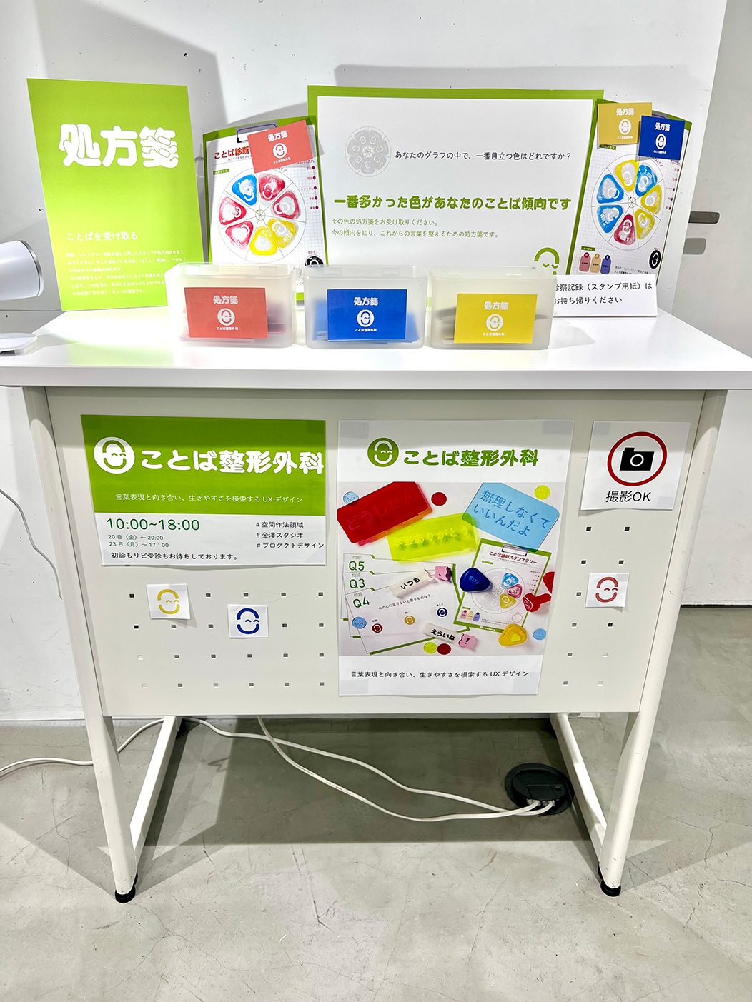 彼女もまた、従来のプロダクトデザインの範疇から大いにはみ出してくれた勇者だ。「自分の固定観念を見つける体験「ふつう」から考える感覚」というテーマは抽象的で、一体何をしようとしているのかを理解することが難しかった。いや、背景として紹介されたSNSをはじめとする同調圧力や、友人同士でも感じる視野の違い、子供が発した何気ない言葉から気付く先入観…など、問題意識は良く分かる。多様性の時代と言われ…様々な価値観や考え方が同居する中で不用意に言葉を発することの危険性や、知らない内に誰かを傷つけてしまうリスクは誰もが抱えている…今に始まったことでは無いかもしれないが、多様性過保護時代ですぐに○○ハラスメントに発展する今の時代の不自然さと生きづらさを彼女達も感じているということも伝わってきた。コンセプトは「自身の固定観念を見つけるための体験」とし、気付き/疑う/知るという3つのフェーズを見に来た人達に体験してもらう…という辺りから、何を企んでいるのかが怪しくなってきた。プロダクトとしてどういう折り合いを付けるのかは暫く横に置いておくとして、どうすれば上記の3つのフェーズを体験してもらうことができるのかを探ることに時間がかかった。「固定観念」や「認知バイアス」「既成概念」といった心理学上の知見と、それらをどういうカタチで示すことが良いのかが分からなかった。本を読んで知った知識を並べるだけならクリエイターが介在する意味が無い…興味関心を持って接して貰うには「あるある」事例を列挙しながらフックとなるキャッチーで具体的なトピックと、それらに対する色々な解釈や考え方を提起する彼女なりのアンサーが必要だと感じた。最終的なやり方に辿り着くまでにもう少しだけ時間が掛かることにはなるが、この時期は手当たり次第に、起こしがちな過ちの事例…特にlookismなど〜ismに見られる「偏見的な事象」(ジェンダー、年齢、外見など)を視点に、事例を集めてみることを勧めた。6月の中旬になってクリニック形式でのインタラクティブな体験空間の構想がまとまり始め、特別展示を目指して具体的なコンテンツの設計がスタートした。今回のプロジェクトにあたり、彼女はかなりたくさんの関連書籍を読んでいる。何冊かを見せてもらったが、解りやすいものもあり、読み終わった後に彼女から借りて私も読んでみたものもある。少しずつ彼女がやりたいことが見えてくるほどに、必要な物量の多さが心配になってきた。一部屋を借り切って、受付/問診/レントゲン/手術/処方箋という流れの中で、参加する人は、自分が何気なく発している言葉の傾向を知り、表現の仕方によって伝わるニュアンスの違いを客観的に感じ、言語によるコミュニケーションに起因する負荷を減らす視点を得る…というもので、各コーナーで行うアクティビティーとそれらに使用する多くのパーツ、部屋を仕切るパーティションに順路を誘導する表示類と患者が手に取る問診票…「ことば整形外科」のロゴマークやサイン計画を全てやってのけた。