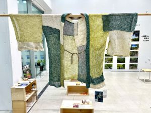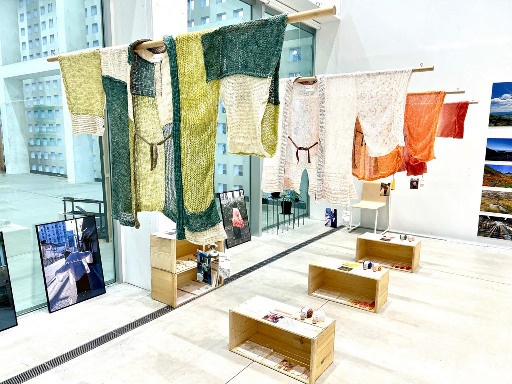 彼女の作品のユニークな点は、着衣としてのアイテムと素材/技法との掛け合わせが新しかった点だ。和服の持つシンプルが故の機能性や合理性と、テクスチャーやパターンとして表現の幅を持ち伸縮性に富んだニット、四季折々の「自然」と向き合いながら「季節」を生活の一部としてきた日本人特有の表現を融合することで、新たな和風ジャケットのカテゴリーを模索した点が面白く新鮮だった。当初、染料にも拘りを持ち、モチーフとした植物由来の発色にチャレンジしたようだが、イメージする発色にならず最終的には市販品をベースにしたものに切り替えたが、あくまでも環境負荷が小さいことには拘りを捨てず、多くの試行錯誤を繰り返したプロセスはとても良かった。工程としても、目指すイメージを再現するための先染め/後染めの使い分け、毛糸のセレクト、編み針の太さ、編みパターンのバリエーションなど表現に対するひとつひとつの要素を丁寧に吟味し制作に反映させた取り組みも良かった。最終的には、物量と時間のバランスなども考慮し、4着の作品を完成させ、中間審査時の構想からは半減したが、馴染みのある四季を意識した1年の流れを追うには、コンセプトの明確化にも繋がったかもしれない。どの色も個性的で明確な差異化に成功しており存在感がある、また形状的にも袂(たもと)がゆったりしたニットという不思議で新しいジャンルを感じさせてくれるオリジナルなものになったと思う。作品集用の本人が身にまとったダイナミックな写真が印象的だが、やはり着衣の評価としては、見に来てくれた人が自分で羽織ってみて姿見に映った様子を見てみたい気持ちになるのではないかと思う。当初、予定していた試着用のコーナーもあるとUX的にもより自分のライフスタイルとの関係を意識しながら鑑賞してもらえたかと思う。「nonokiwa」は「野の際」という意味らしいが、万葉和歌集にある藤原実定の「安達野ののきはのますげもえにけりいはゆる駒のけしきしるしも」で詠まれている…春から夏への季節の移ろいと若駒が「のきは(野際)」=「野の際」を走る…季節感や生命力に満ちた景色を連想する洒落たネーミングだったと思う。