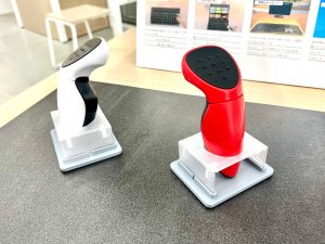 もちろん現状でもVRにおける文字入力は可能だが、ゴーグル内でのバーチャルなキーボード操作では指へのフィードバックが無いことや、パススルーによる実際のキーボード操作では場所がデスク上に限定されるなどVRの魅力をスポイルする可能性があること、またボイスコマンドでも環境やプライバシーの観点からハードルもあることなどを背景に、障がい者への対応も含め様々な入力方法の確立を目指すひとつとして研究がスタートした。日本人特有の機構ではあるが、フリック入力は慣れると速い速度での入力が可能で、何かに触れているという指先へのフィードバックも返って来ることからブラインド操作となるVRへの親和性もあると感じた。彼は高校の専攻科からの編入組で専攻科時代の卒業制作でもVRで楽しむゲーム制作をしていた経験もあり、自身で回路やプログラムを組みながらワーキングモデルを作ることができるスキルを備えていた。様々な関連する研究の資料を読みあさりながら、フリック入力の精度と速度についての裏付けをとりながら、この研究の意味を確認していった。当初、ジョイスティック式のメカニズムでも検証を行い、稼働モデルでの問題点の洗い出しを行っている。ネックとなった課題はサイズで、ジョイスティック式に必要なレバーの可動領域と基板の大きさが、適切なコントローラーのサイスとは相容れなかったようだ。タッチパッド式のアイデアに切り替えてからはサイズの課題は解決したが、ブラインド操作への対応が次の課題となり、パッド表面の凹凸やサイズについて検証し、最終的なアイデアを固めている。完成したモデルでは、タッチパッドのサイズ感は最適解を見つけたかもしれないが、10個の突起についてはホームポジションとも言うべき手掛かりとして、例えば中央(上から2段目のセンター)だけ高さか大きさ、或いは形状の違いを設けるなど、ブラインド操作への配慮があっても良かったと思う。一方、コントローラ全体のスタイリングについても幾つかのプロトタイプを準備し、グリップのフィーリングや操作部分へのリーチなど細かいチューニングを施し形状データへのフィードバックを行っている。一連のプロセスは、まさにデザインの現場で行われている流れそのものであり、リアルな商品開発の手順をしっかり踏んでいる点で信頼できる機構とスタイリングになったと感じる。最終的な作品は文字入力に関連する部分がクロースアップされ、文字入力の専用機のようなイメージもあるが、タッチパッドの応用や、必要なトリガーをグリップに想定することで、従来のコントローラーの機能も付加出来ることを前提としている。一貫したテーマへの拘りと、しっかりした仮説と検証の繰り返し、機能と美しいと感じるカタチとのバランス…振り返るとあまり多くの議論を交わすことができなかったかもしれないが、作業の内容については申し分無かった。プログラミングの領域になると私自身が指導出来る範囲を越えているため彼の作業を見守ることしかできなかったが、彼のようなデジタルネイティブな世代が、これからのデザインの現場を変えていくのかもしれない。