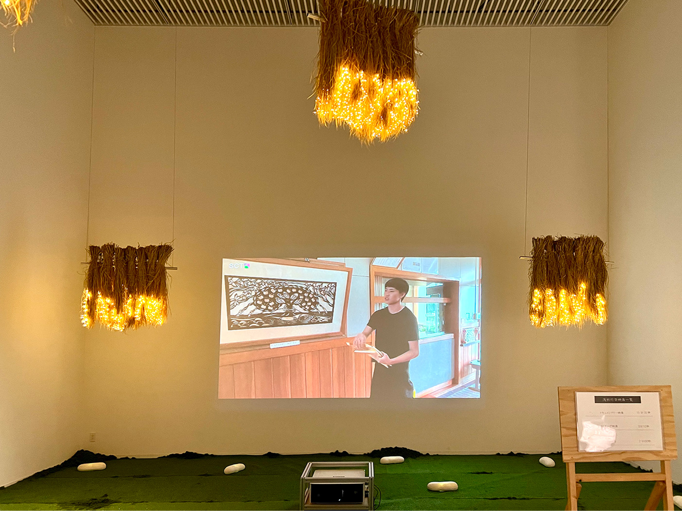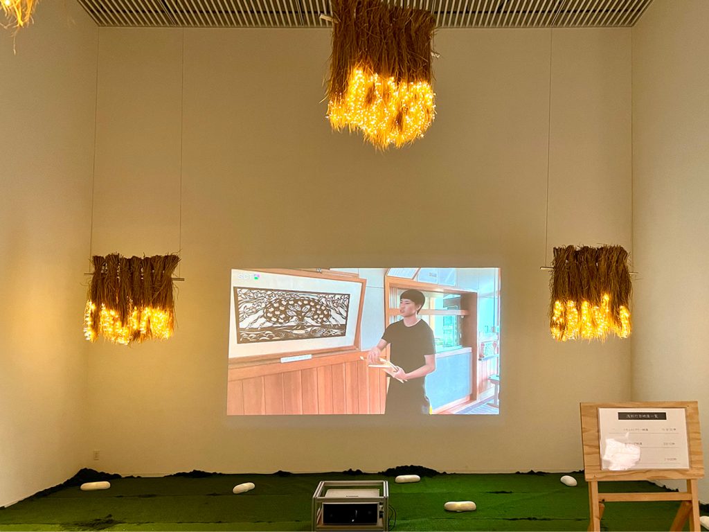 学内でできる工作作業以外の多くの時間を、彼は現地での調整や交渉に費やしたと思われる。企画自体をまとめなければ、まともに話を聞いてはもらえないし、地域興しとしての意義(相手のメリット)を理解してもらう必要もあれば、実現するための物資や人手、資金の約束、そして何より「やらせて欲しい」という熱意が伝わらなければ全てが絵に描いた餅になる。幸いにも現地の方々の暖かい受け入れを頂いたことは僥倖だった。大学では、構想として約束したイベントを実現するために照明器具の設計と制作に明け暮れた。イベント自体が11月の始めだったこともあり、他の学生よりも「ものづくり」の着手は早かったが、効率的に作業を進める工夫と実作業を平行しながら行う苦行はプロが必ず通る道だ。その後も、ものづくり作業と並行して、行政との調整やローカルながらもマスメディアへの売り込み、教育実習でお世話になった学校の先生方や生徒達までを巻き込んでの設置作業など、社会への働きかけや多くの人の助けを借りて、ひとつのエリアを動かすことができた事実は素晴らしい。プロデューサーとしての実行力が多くの人を巻き込んだひとつの「出来事」になり、空間作法には今までになかったチャレンジとなった点が大きな成果だ。展示では、イベントの様子を現地のテレビ局が取材し番組にしてくれたドキュメンタリー動画を投影しながら、イベントで使用した照明具を疑似体験してもらう計画とした。暗闇で使う道具のため、プロダクトとしての仕上がりには多少目を瞑るとして、実際に暗がりで光る稲穂やカボチャを模した光は映像の中では本当に美しく、企画を受け入れてくださった皆さんや参加してくださった沢山の人たちの記憶に残るものになったのではないかと思う。仕事の面白さを実感するのはハラハラしながら費やした多くの手間と時間が、そんな苦労を知らない人達に自然に受け止められ、無邪気に「楽しかった」「きれいだった」と口にしてもらえたその瞬間に違いない。全てが報われる瞬間だ…番組で紹介されたこの一言で、彼は「自分はやり切ったのだ」と実感したのではないかと思う。これもまた、従来のプロダクトデザインの枠組みの中では難しかった取り組みだったかもしれない。モノがあり、空間設定があり、プロモーションがある…分野横断的な広がりが空間作法らしいアウトプットだったと思う。