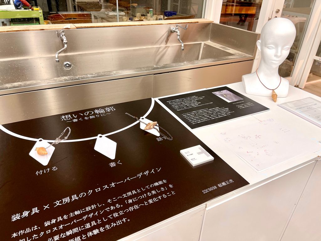 入学当時から文具が好きなことは分かっていたし、取り分け筆記具に関する知識も豊富だとは思う。選んだテーマも「自分の理想のカタチでカスタマイズできるシャープペンシル」からスタートした。 初期のレビューでは、カスタイズすることでどんな世界が広がるかが大切であり、色々な素材でできた同じカタチのシャーペンが並んでいるだけではつまらないので、色んな場面でどんな人が「書く」行為をしているかを想定し、それに特化した機能をアタッチメントで付加できるなど、意匠性+機能性の幅を増やしてはどうか? 先ずは、現状のシャーペン市場を振り返り分析、ビジュアライズ(資料化)するところからスタートすべきと感じた。暫くは…カスタマイズする目的にアイデアの幅が必要だと思われ…例えば、角度が変わることが目視できて正しい持ち方が身に付くものや、重心のバランスをグラム単位でチューニングできるマニアックなもの、或いは、芯を替えるプロセスがスマートになるものや、香りを付加して集中力/リラックスをサポートするような五感を使った楽しみ方…など、パーツ交換が、どんな場面で何をもたらしてくれるのかを意識しながらリサーチを行う…といった話をしたと思う。中間審査も近づいた7月に入り、「文具を身にまとう」というテーマに変更し、短期間で資料をまとめることになる。中間審査では、アクセサリーと文具の融合として、ネックレスやバングル、キーホルダーなどに文具機能を合体した概念を示したが、「アクセサリーのような文具」なのか「文具の機能を備えたアクセサリー」なのかも判然としなかった。後期に入ってからも大学で対面の授業をする機会は少なく、彼なりにカタチと素材を探りモデルを作ってきたが、その経緯やカタチの意味、サイズやカラー、機能性や使いやすさといったIDとしての仮説と検証は、残念ながら感じることができなかった。