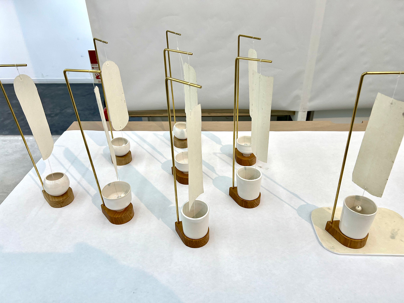当初、彼女のテーマは「生活に日光を取り入れる提案」…日の光と暮らすカーテンというものだった。イメージ写真で説明された資料も、光を効果的な演出に使った空間設計に近いものと理解した。しかし程なく、当初のテーマを再考し、風によって生まれる現代版風鈴(音と動きによって自然を感じることができる装置)を作る方向に舵を切り、最終的な提案に繋がった。基本的には同意しつつ、どういう効果を狙い、どんなシーンで、どんな時にどんな音を出すモノなのか、どんな素材を使用するかなどの商品フレームを固めることを4月/5月で行った。確かに、昔は軒先にぶら下がっていた風鈴は、いつの間にか姿を見かける機会が減り、最近では「音がうるさい」といった苦情の対象にもなるというので、風情も無くなったと感じることも多い。また、風鈴の音を「涼しげ」に感じることができるのは日本人だけ…というレポートも見たことがあるが、生活音のひとつとして日本に根付いてきた風習や文化にスポットを当てることには意味があるとも感じた。そんな時代背景も受け、彼女の提案は室内で楽しむことができる風鈴で、エアコンや扇風機の風、人が近くを通り過ぎた時の僅かな対流で心地良い音色を出すことを狙うこととしたようだ。こういうテーマではお約束の1/fゆらぎのスタディーから始まり、途上では「香り」の要素にも幅を拡げた。従来の風鈴のカタチに縛られない造形を目指す上で、台上に置かれた陶器製の器の中で、風を受ける短冊の下に付いた振り子状の玉が動くスタイルを基本形状とした。彼女にとって大切な「音色」については拘りがあったようで、ある時期から陶芸室で器の形状、大きさ、厚さなどのバリエーションを試し、音質との関係性を模索するプロセスはとても良かった。室内で使用するものなので風が無い時には音が出ないことになるため、磁石などを用いたランダムに振り子が動く機構なども検討したが、最終的にはギミックに頼ること無く、風が無ければ音はしない…当たり前の状態を自然なこととして受け入れることにした判断も良かったと思う。その代わりに短冊は少し大きめで、近くを人が動くだけで音がするバランスにチューニングしたようで、これも奏功していると感じた。彼女は、こちらから話しかけないとなかなか会話ができないキャラクター(?…嫌われているだけ?)だが、地味にプレゼンは上手く、展示初日に行ったJIDAへの説明も質問に対する対応も卒なくこなしてのを見て感心した。そういう意味でも、ひとりで黙々と作業を進めることができる点では手が掛からない(?)学生ではあった。好きな言葉に「実践躬行」を上げる彼女なので、人任せにせず身をもって実践することを信条にしていたのかもしれない。スタジオ選択時には「制作すること自体よりも、デザインや機能自体を考え作ることに興味がある」という通り、光を透過する陶土の用途開発では、ホテルのキーホルダーを作ったり、ソファーの肘掛けに巻き付くような簾状のトレイを作ったり、オフィスでリフレッシュするための寒天サプリを考えたり…と、ユニークで独特な着想をする人で、いつも意外な発想が楽しみな学生だった。淡々と…飄々とした様子が日常で、彼女が苦悩している姿を見ることができなかったのは、指導者として踏み込めていなかったからかもしれないと思うと申し訳無い気持ちになる。