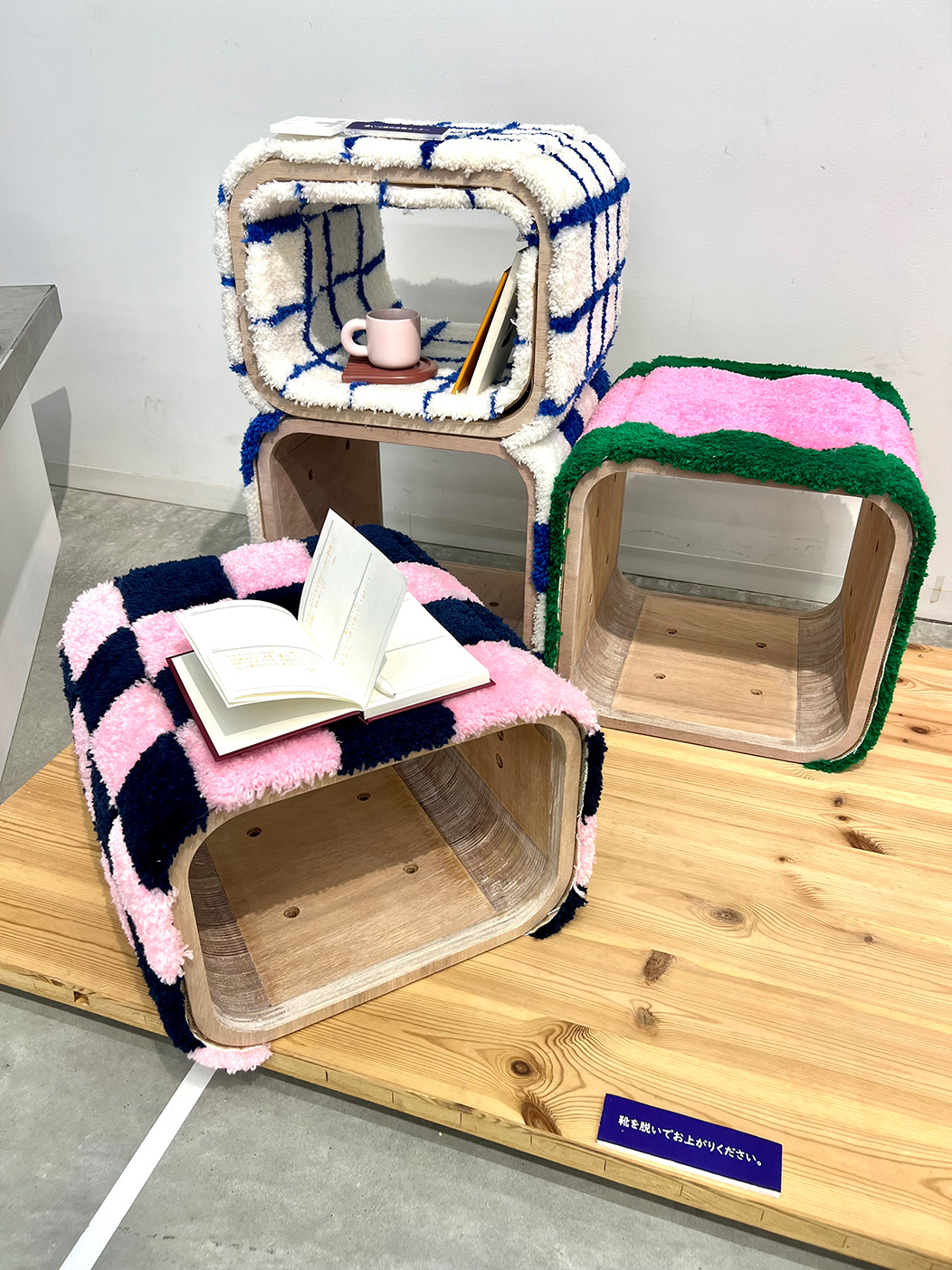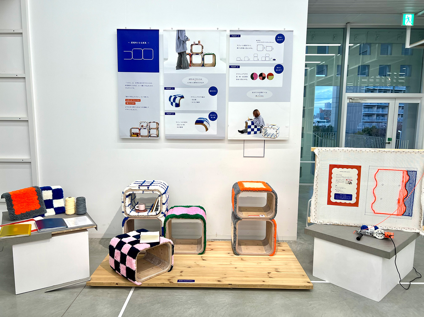 本番用のモデルの着手が遅かった点は否めない。コーナーRの大きな四角い筒を合板で作るために、たくさんのコーナーRの形状を切り抜き積層したが、同じ工程を繰り返す中で、自ら3Dプリンターで治具を作り、精度良く効率的に積層できる方法自体を考案したのは良いアイデアだった。数を作る必要から時間との戦いになり、一時は目標数よりもクオリティーを上げることも考えたようだが、最終的にはクオリティーも数も諦めること無くやり遂げたことも良かった。完成した6個のキューブは、シンプルな造形だがタフティングによるビビッドな存在感が与えられ、「居場所になる家具」という不思議なコンセプトは分かりやすい表現になったのではないかと思う。