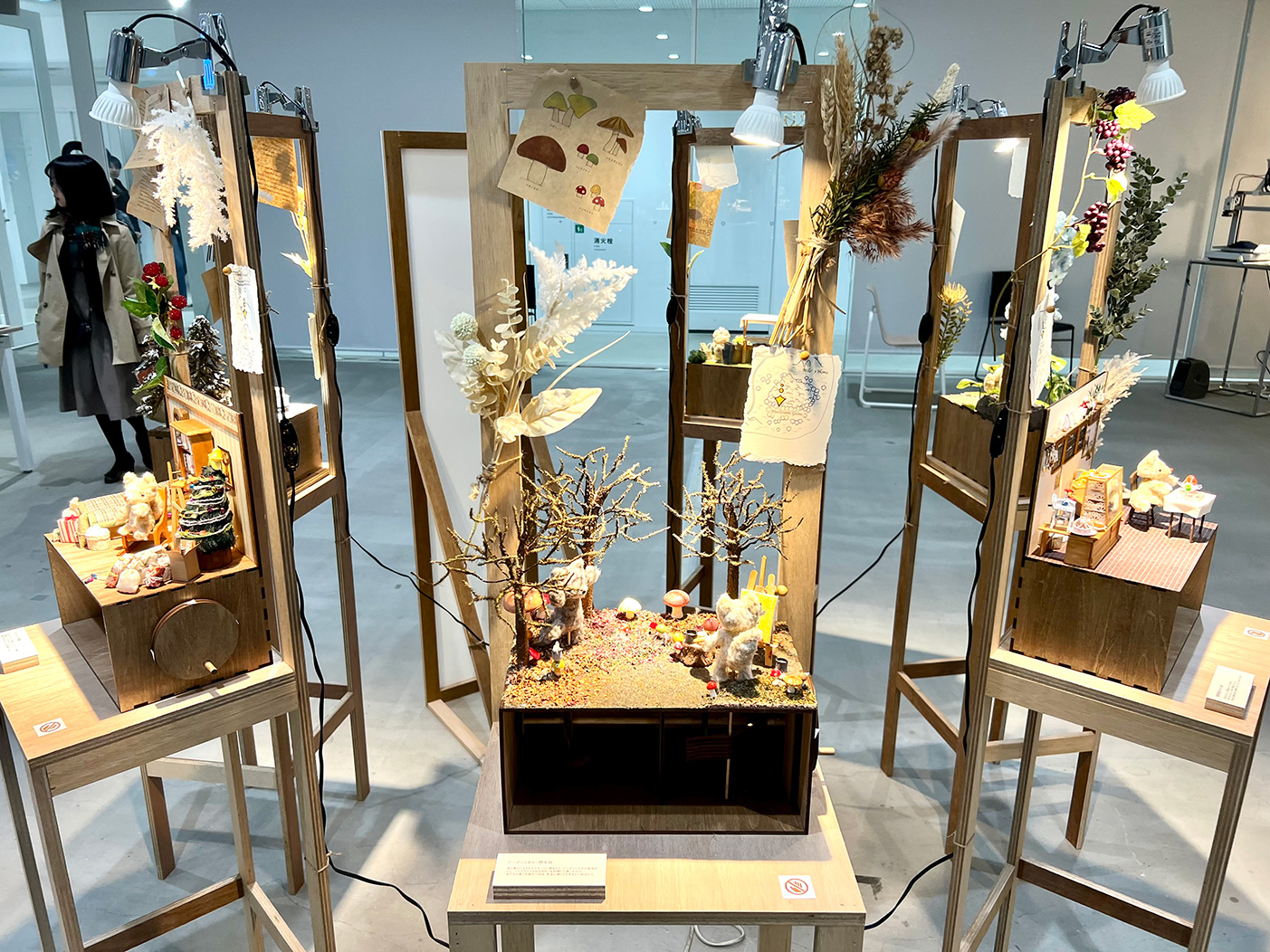 小さな幸せに気付かずに通り過ぎてしまう…それが彼女の問題意識であり出発点だった。表現として「からくり人形」を選んだのは、彼女の個人的な好みの要素が多かったかもしれないが、見る人に喜んで欲しい、笑顔になって欲しいという想いや気質は、デザイナーを志す人にとっては大切で…もしかしたら最も必要なコンピテンシーかもしれない。彼女の世界観はいつも穏やかで柔らかく、見る人の心を優しい気持ちに変えてくれる。研究の初期ではサプライズの要因について調べたり、心が動く体験や思わず見入ってしまう要素について考えたようだ。驚きと感動を通して気持ちが変化する体験をしてもらう…そんな構想を持っていた。お稲荷さんで有名な豊川出身の彼女は3年生の時から「キツネ」をモチーフにした作品を考案しており、今回も結構早い段階で「キツネの日常/休日」という設定を持っていた。「からくり」で表現すべき…1年間を通して切り取る場面やイベントの洗い出しを進め、5月の終わりには12個の「からくり」で1年を綴る立体絵日記の構想がまとまっていた。肝心の「からくり」の構造については、初めてのこともあり、どういう仕組みや構造で意図通りの動きを再現するかについては、既存の「からくり」を調べてみる必要があり、動きに関する相談に応じるために私自身も動画サイトで流れている「からくり」関連の解説ものを片っ端から保存した。登場するキャラクターデザインから始め、平行して「からくり」の原理モデルをスチレンボードなどで試作していたようだが、剛性が足りないこともあり、なかなか機構としての図面に進むには時間が掛かった。本番用の材料で箱を組んだ後も、思うように摺動しない状況が続き何度もトライ&エラーを繰り返した。あーでも無い/こうでも無いと調整方法を考えた末、ひとまず狙う動きが確認できた時に、真っ先に動画を撮って送ってくれたことが嬉しかった。キツネのキャラクターはスケッチの段階から素朴なものだった。強い個性を持つビジュアルには、見ている人が感情移入し難いことへの配慮と思われ、平凡な毎日に小さな幸せを見出す役回りとしても適切な設計だったと思う。キャラクターの表面処理として植毛をすることに決め自分なりに調べた結果、ファーヤーンを使う技法を見つけ出し施したところ、想像以上に良好な仕上がりになり、周囲との質感の差異化と存在感の演出に効果的だった。登場するキャラクターは、主人公のマイロ、友達のアーデン(狼)、ねずみの3体だけだが、ねずみは各場面で必ず何処かに登場する設定で、この他にもある場面で釣った魚が別の場面で店に並んでいたり、ある場面で描いた絵が別の場面では壁に掛けられていたり…見る人が時間の流れを感じながら、物語を発見する楽しさが仕込まれている。また、作品は大きなダイヤルを回すことで稼働するが、操作する時に木が擦れる音がする。当初は想定していなかったアクシデントだったが、この軋むような音が、アナログな感じや木の温もり、手作り感を強調するようで、敢えて消音対策をすることをやめたことも、工作プロセスの中で作者自身が発見した楽しさだった。精巧でスムースな動きを実現することが難しかったこともあるが、ぎこちない動きだからこその素朴さが味わいにもなった。「からくり」を作りたい強い思いでスタートし、全てが手探りの中で想像以上の手強さに苦しみながらも、(制作する場面数は減らすことになったが)最後まで細部に拘りながら、当初彼女が意図した通り、思わず見入ってしまう作品になったと思う。