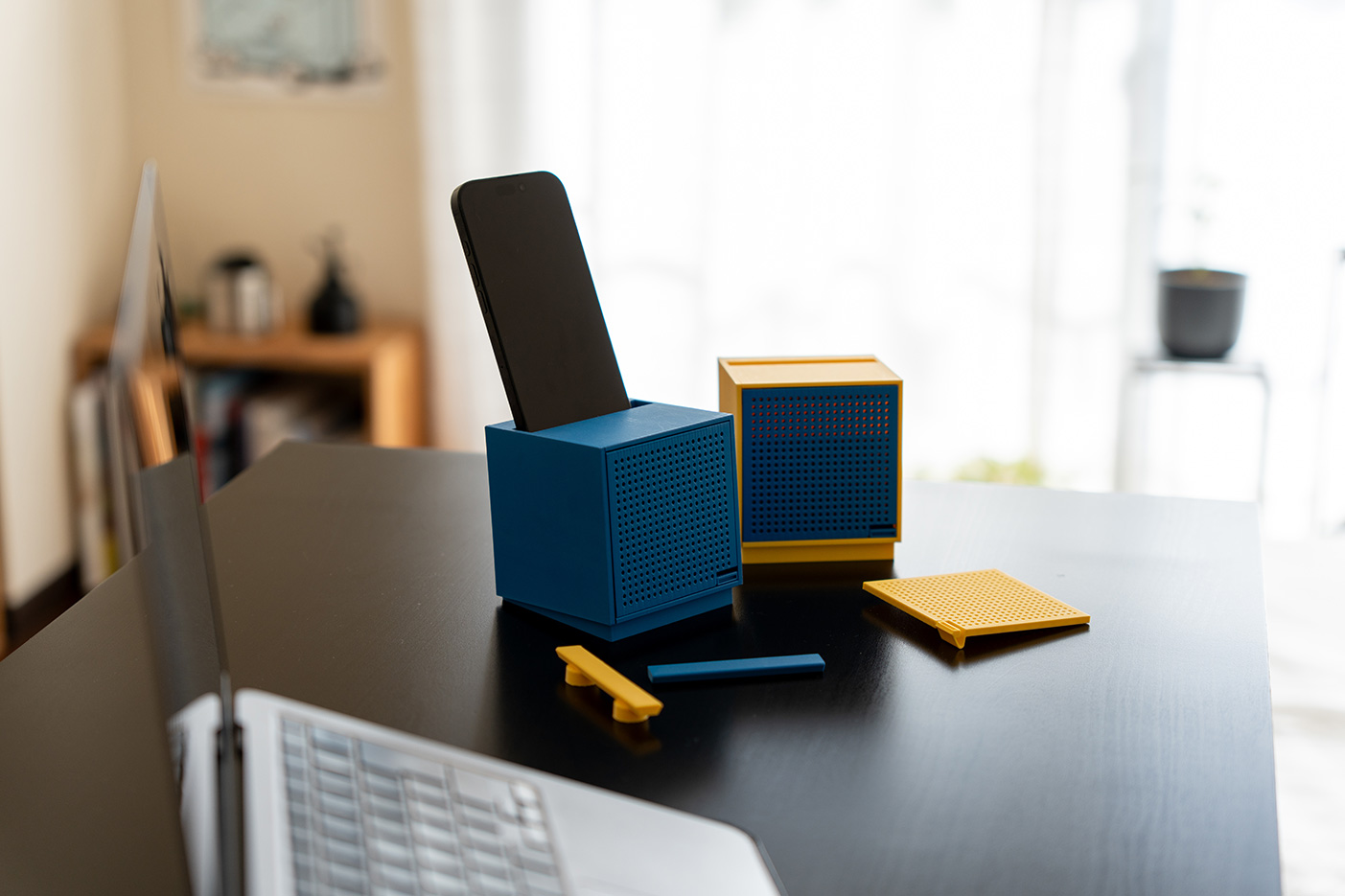 途上では、スピーカー、照明、収納BOX、ワゴン、プランターなどもアイテムとして検討しており、ステーショナリーなども含めたデスクワークでの周辺にある商品という切り口でブランドイメージを固めるのも悪くないと感じていたし、網目状の成形では、空気、音、光、香り…見えないものを透過する装置として「空気を扱うプロダクト」という切り口なども興味深いと感じていた。