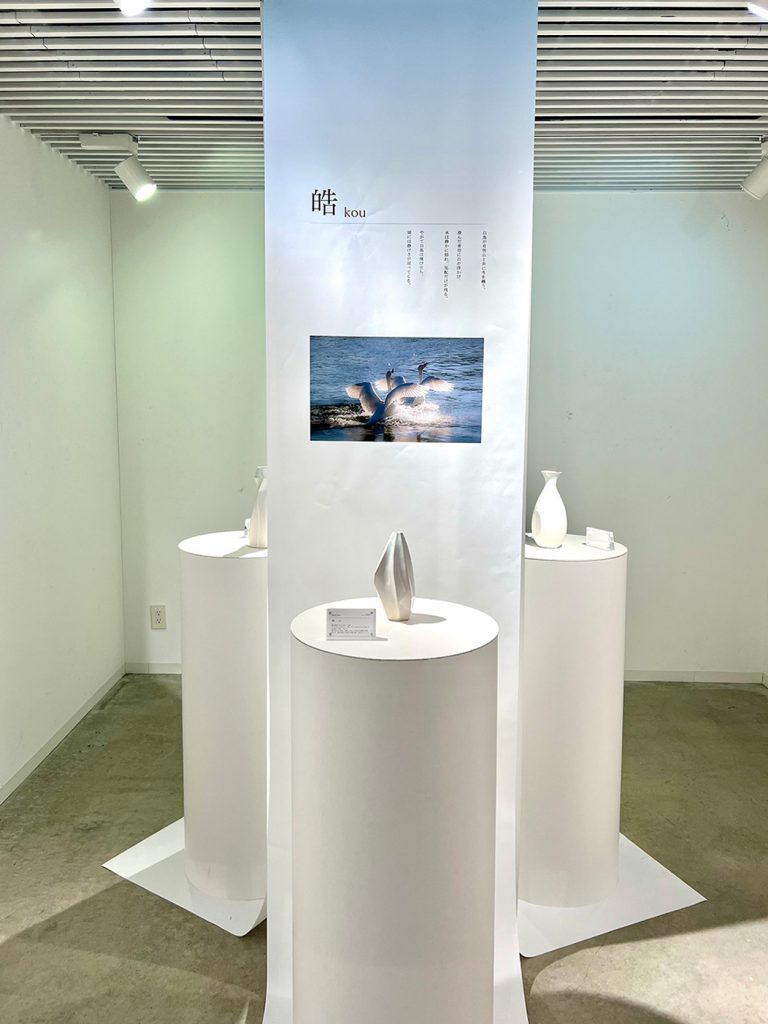 最初の授業で、テーマ発表を行った時は「『自然と共に暮らす』木の灰を釉薬にした陶器のブランディング」という内容で、これまでの創作活動の中で陶器に対する相性が良かったのか、「釉薬」にフォーカスした製品作りを当初から想定していた。この時点で自身の生まれ故郷である「安曇野」の自然と向き合うこともイメージしており、安曇野由来の木の灰を釉薬に使う構想がメインテーマと受け止めた。着手したプロセスも、テストピースを作り色々な木の灰と長石の配合比を変え焼成しては色合いや流動性、表現の違いを観察する研究色の濃いスタートとなった。誰しも生まれ育った土地に対する想いは深いが、当初、ブランディングの対象として『安曇野』に決めることに不安を感じている様子だった。話すうちに本人が取り組みたい内容の優先順位の一番がブランディングであることから、一旦テーマを『安曇野』で仮決めし、並行して釉薬の検討をすることとした。アイテムについては、食器、花器、ランプシェードなど5種類を検討し、「安曇野」の解釈を意識しながら、アイデアスケッチに入ったが、ブランディングまでやりたいとのことだったので、考え方…核になる要素、特徴などを並行して考える必要があった。最初の造形…後の「晧」(こう)となる基本形状が見え始めた頃、見た目で安曇野と分かる必要はあるか…との相談を受けたが、作者がインスピレーションを得て解釈したもので良い、見た目で分かる具象性よりも作者の感性というフィルターを通した物作りで良いと回答した。…と言うのも、その非対称なカタチには妙な魅力があり、山の稜線を思わせる独特の3次元的なエッジによって、美しい印影と見る角度によって表情を変えるユニークな佇まいを持っており、荒削りではあったが彼女の造形センスを充分に感じさせる立体と感じたからだと思う。彼女の中では、山の稜線と白鳥のシルエットという具体的なモチーフがあったようだが、丁度良いさじ加減で抽象化されていることが良かったと思う。この彼女の造形センスは2つ目の「澄」(すみ)にも3つ目の「岑」(しん)にも発揮され、それぞれに異なる表情を見せる造形には素直に美しさを感じることができた。ただし、形状の複雑さ故に鋳込み型を作るための工程には苦労したようだ。3次元的なパーティングラインの設定や割型の数と向きなど、これまでの陶芸の経験とは異なる考えやプロセスが求められ、ものによってはメス型を鋳型するための型を3Dプリンターで作るなど、チャレンジングな取り組みにも挑み、きちんとモノにした点も素晴らしかった。一方、最終的に木の灰を使う釉薬の研究としては、信州檜灰など素材については安曇野由来に拘った方が良いと思いながらも、期待する表現に繋がらないという結論を導くことになりはしたが、このプロセスこそが研究であり大切な時間だった。しかしながら、それぞれにユニークな3つの形状をひとつのブランドイメージに関連付けたのも釉薬だった。白をベースに仄かに澄んだ青みを感じさせる釉薬を霧吹きで吹く工程から生まれた優しいグラデーションは、造形のテーマとなった「雪山を背景に湖に飛来する白鳥」にも「雪を被る険しい峰」にも「濁りの無い清らかな水」にも…全てにマッチする絶妙な美しさを表現することに成功したと思う。彼女が最もやりたかったブランディングについても、ブランド名やロゴの設定を含め、パッケージやショップバッグなどへの展開を進め、作者がこの1年間大切にしてきた世界観を確かなものとして表現したと思う。ブランディングはグラフィカルなアイデンティティとしての捉え方をする向きもあるが、「Sree」では、何よりも「モノ」が持つ美しさと存在感があっての成果だと思う。