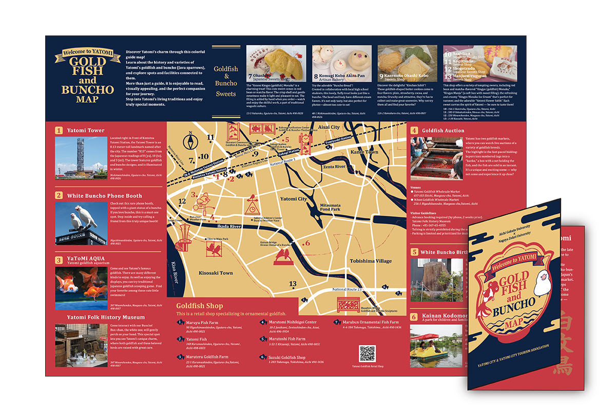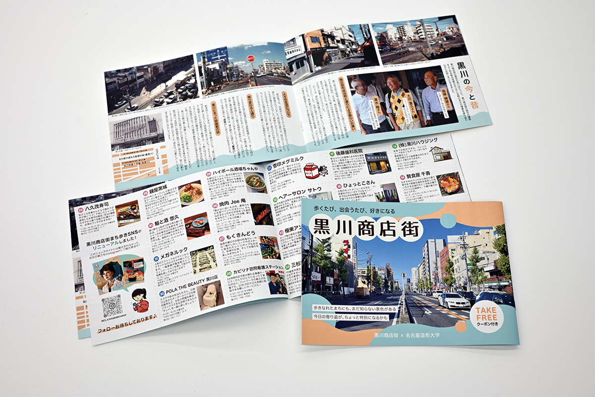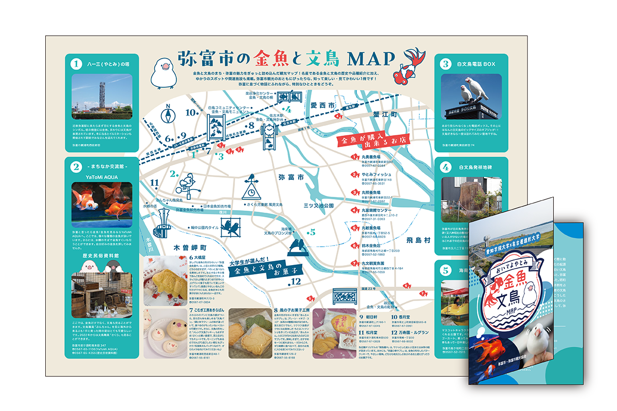 リーフレット・マップ制作 学生の思考力・表現力向上を目的として、観光マップやまちあるきマップをはじめとしたリーフレット制作を行なっています。学生が実際に現地を視察し、学生目線ならではの発想を活かしながら、地域の魅力発信や課題解決につながる取組みを目指します。 実際の制作事例 ▲弥富市役所×愛知学院大学×名古屋造形大学 「弥富市マップ(英語版)」 ▲弥富市役所×愛知学院大学×名古屋造形大学 「弥富市マップ(日本語)」 ▲春日井市教育委員会×名古屋造形大学 「かすがい あそびばマップ」 ▲黒川商店街×名古屋造形大学 「黒川商店街マップ」 ▲大杉まちづくり会×名古屋造形大学 「大杉学区界隈今昔地図」
