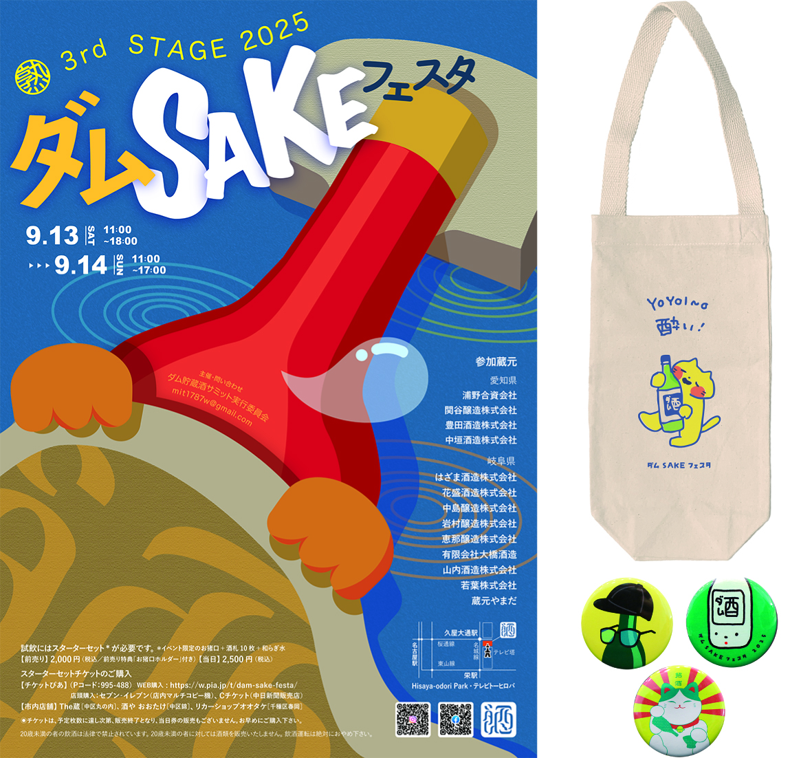 ダムSAKEフェスタ 連携事業 『ダムSAKEフェスタ』は愛知・岐阜の13酒蔵が、地元4つのダム(矢作ダム・丸山ダム・阿木川ダム・小里川ダム)とタッグを組み、2023年にスタートしたプロジェクトです。2023年にはダムに貯蔵する前の日本酒を味わうイベントを開催、2024年には開催酒蔵の地元のダムで1年間貯蔵した熟成酒を楽しめるイベントが開催されました。 本学では映像文学領域・空間作法領域の学生がイベントに関する広報物やイベントツールの制作に取り組みました。 2024年度 ポスター制作 2025年度 ポスター・イベントツール・イベントディスプレイ制作 ページ内目次 視覚表現領域 空間作法領域 社会交流センター