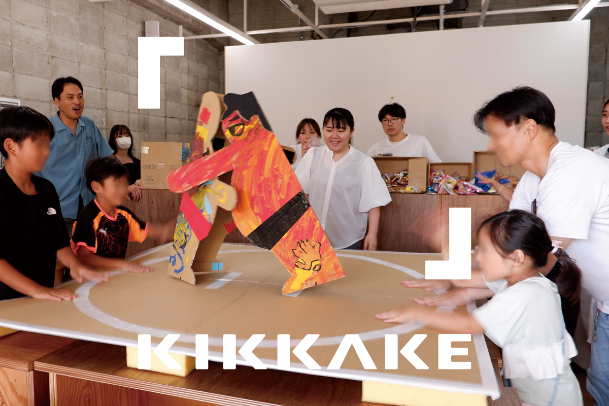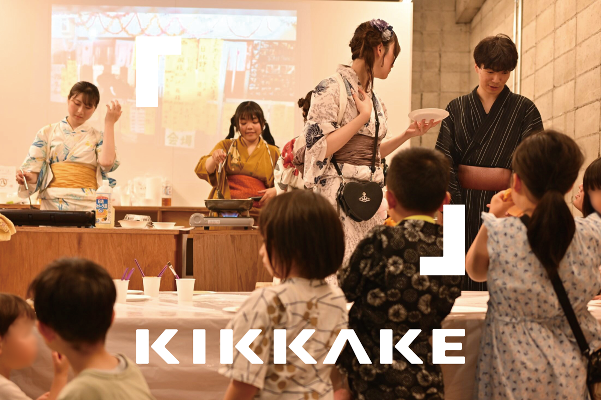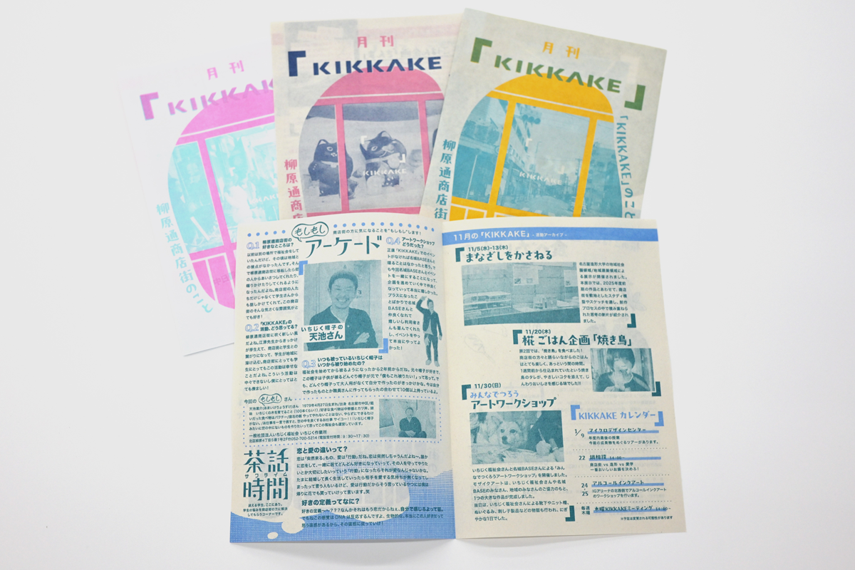次の段階として、商店街と共に拠点の名称およびシンボルマークを検討しました。「KIKKAKE」と命名し、この本拠地を基盤にサテライト授業やワークショップの実施、地域住民と共同したイベントの企画運営などを行い、商店街を舞台とした実践的な地域連携活動を展開しました。また、活動内容を地域に共有するためのフリーペーパーの制作・発行にも現在進行形で取り組んでいます。