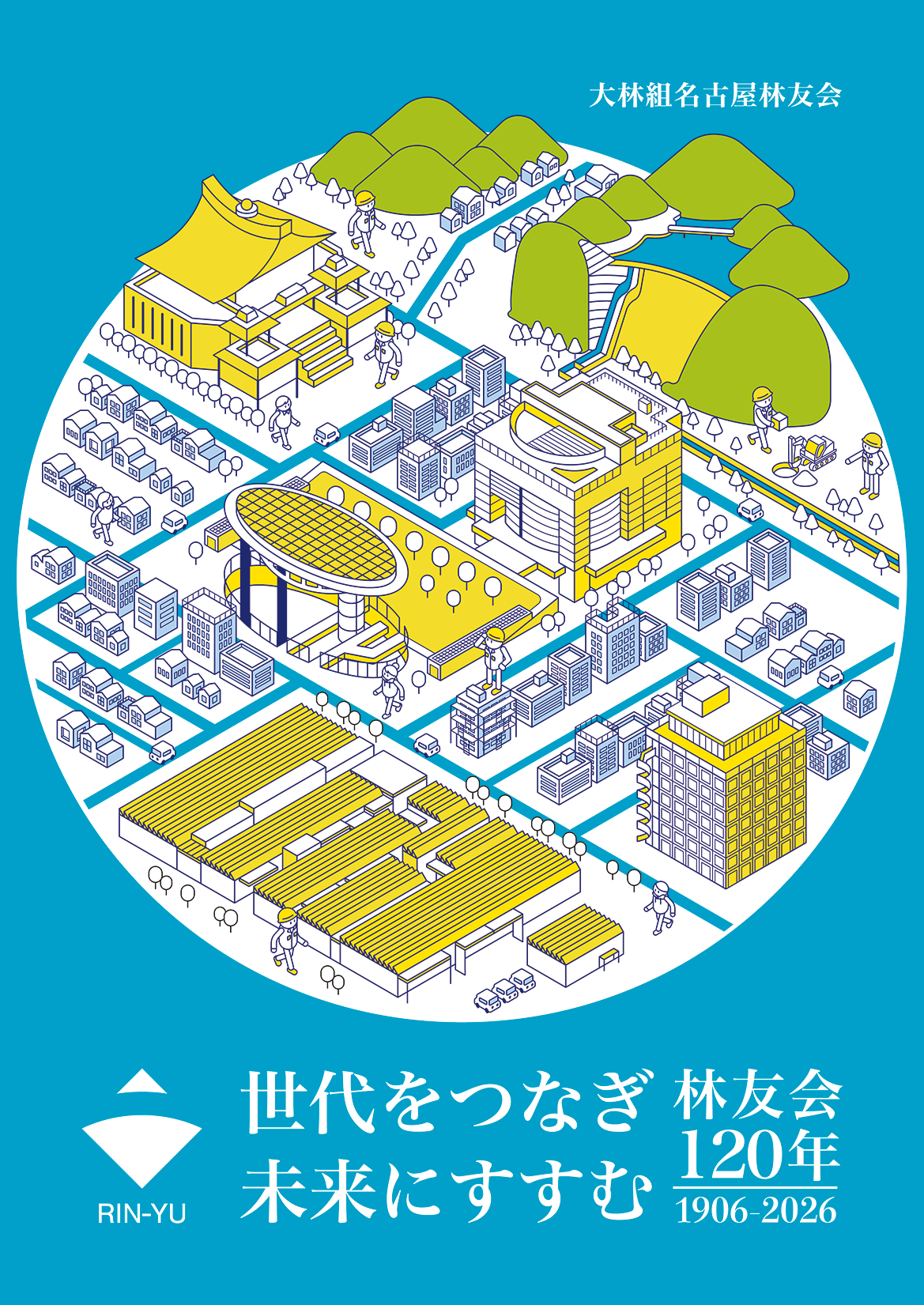 輪をテーマに、名古屋林友会が大切にしている「チームワークと和」を表現しており、輪の中では、まちが少しずつ形づくられていく様子が描かれています。その中心に、大林組がこれまで手がけてきた建物などが配置されています。