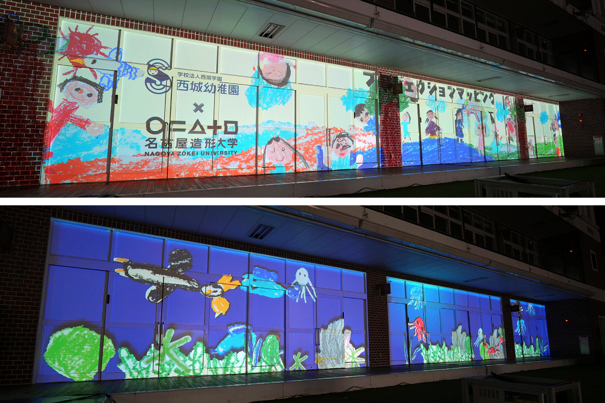 西城幼稚園 西城幼稚園の年長組を対象に毎年行われている夏祭りにて、プロジェクションマッピングを行ないました。 今回はマッピングの映像内で園児たちが描いたイラストを登場させるために、実際に園児たちに絵を描いてもらいました。 当日自分たちが描いたイラストが建物に映し出され、園児たちは大喜びで大変盛況となりました。 ページ内目次 情報表現領域 社会交流センター