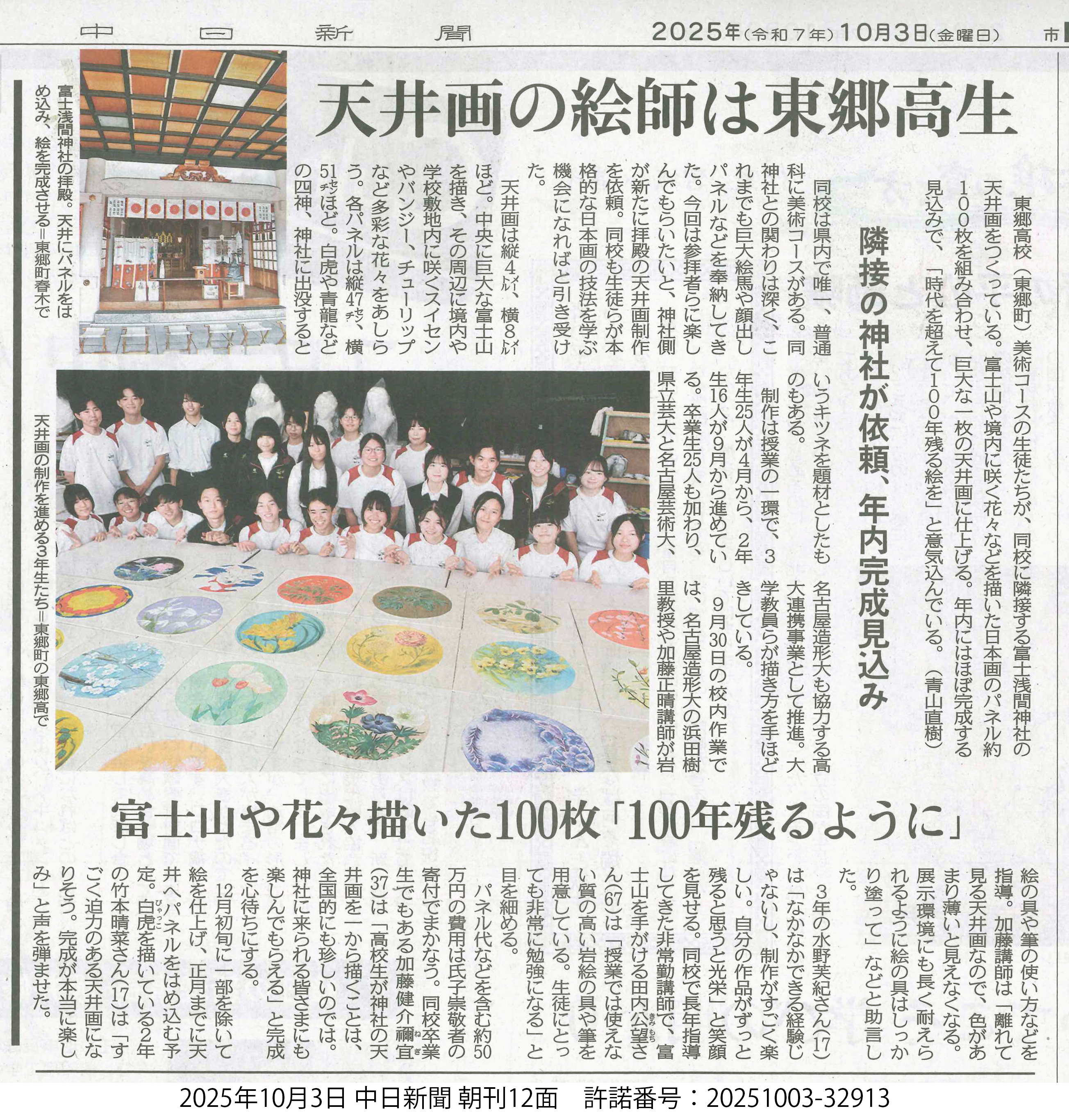 美術表現領域 東郷高校との高大連携の様子が新聞に掲載されました 東郷高校 美術コースとの高大連携授業の様子を新聞に掲載していただきました! 東郷高校の生徒と大学の教員が高大連携授業として富士浅間神社の天井画をつくっていくものとなっており、富士山や境内に咲く花々などを描いた日本画のパネル約100枚を組み合わせ巨大な1枚の天井画に仕上げていきます。 新聞の記事では天井画の説明や、東郷高校の生徒さんの意気込みなどが書かれています。 ぜひご覧ください。 美術表現領域 濱田 樹里