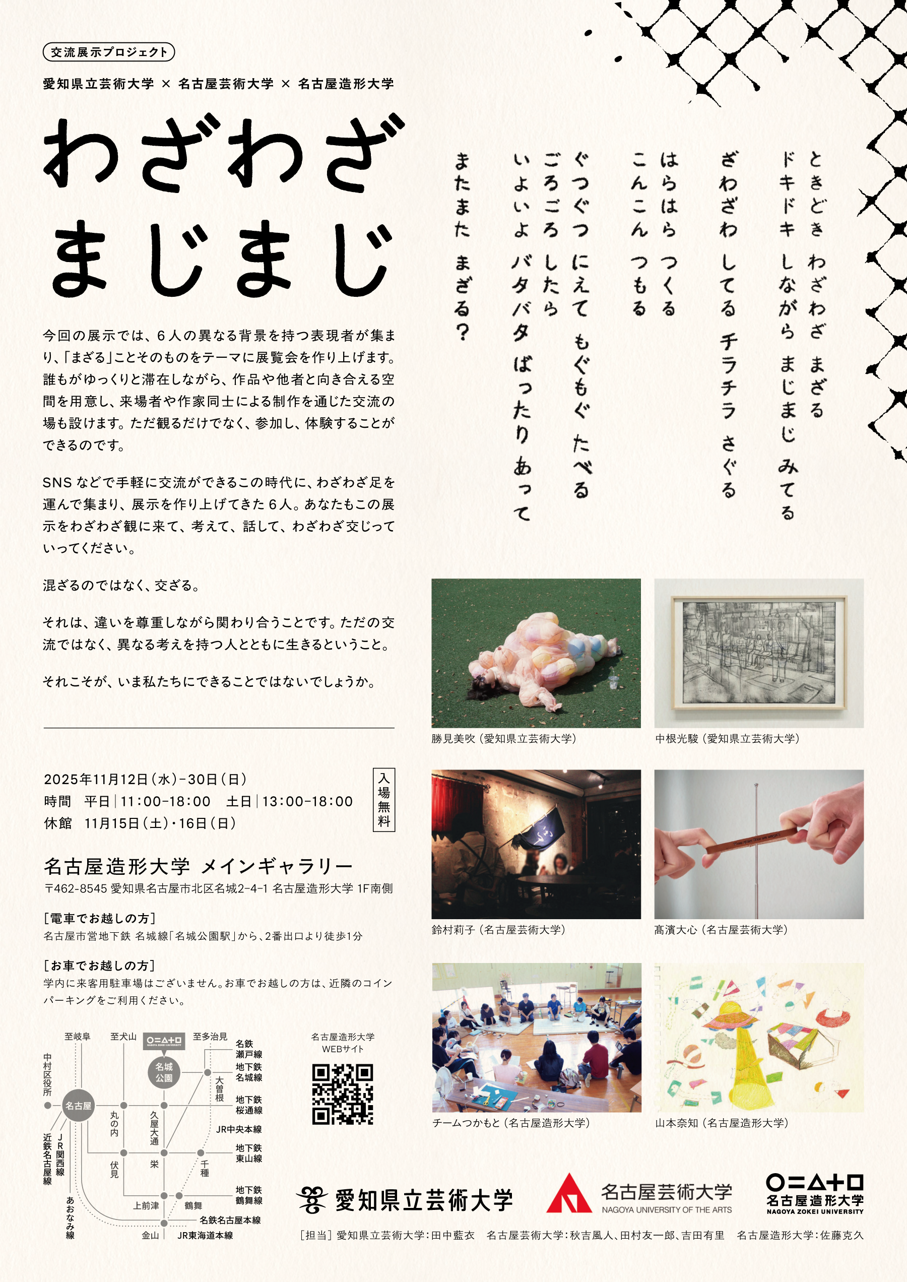 SNS などで手軽に交流ができるこの時代に、わざわざ足を運んで集まり、 展示を作り上げてきた 6 人。あなたもこの展示をわざわざ観に来て、考えて、話して、わざわざ交じっていってください。 混ざるのではなく、交ざる。 それは、違いを尊重しながら関わり合うことです。ただの交流ではなく、異なる考えを持つ人とともに生きるということ。 それこそが、いま私たちにできることではないでしょうか。