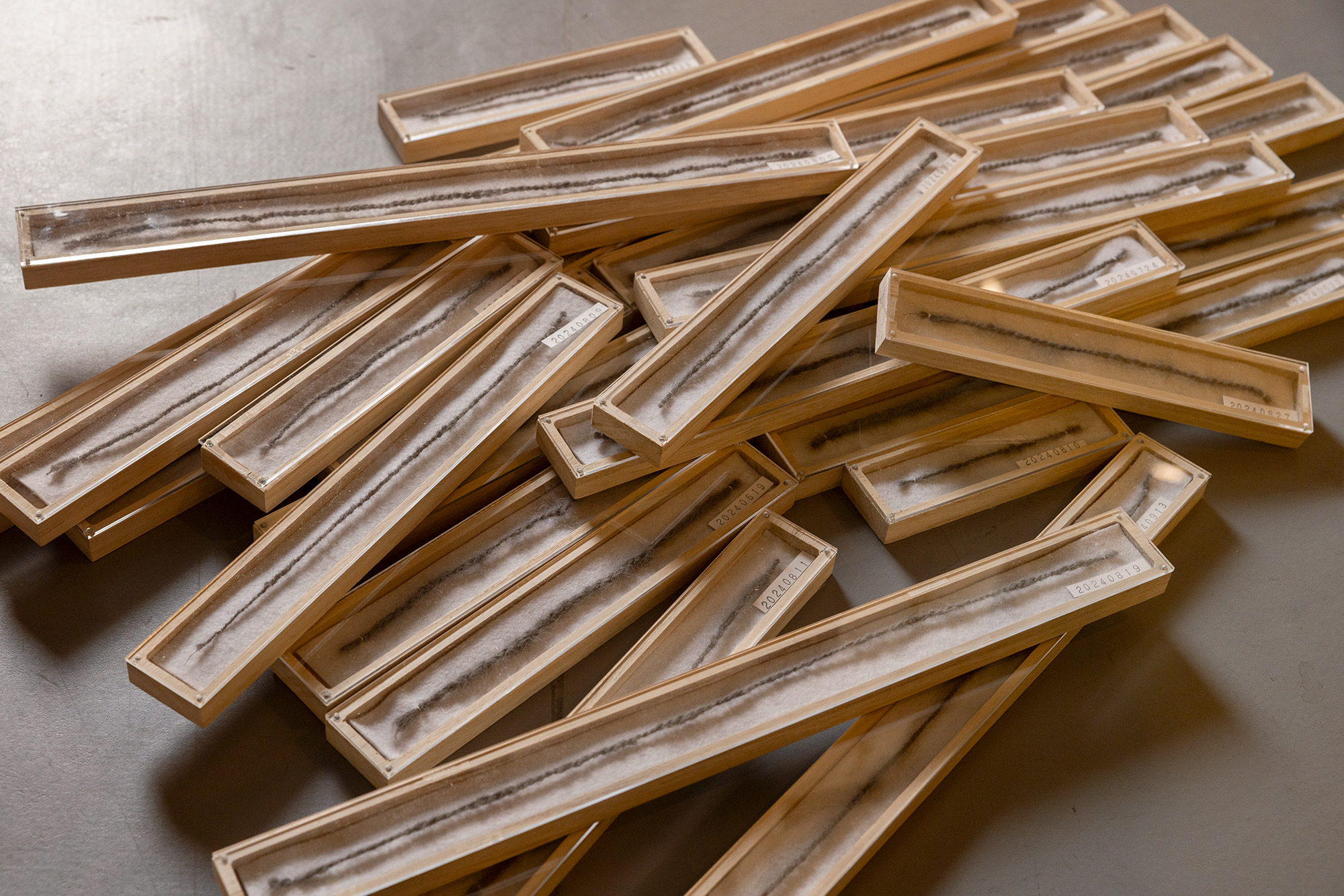また、このプロセスはインスタレーションとして展示することで特異な広がりを獲得している。私的な対話の記録が空間に配置されることで、気配のようなものが立ち上がり、鑑賞者自身の身体感覚や、誰かと共に過ごした時間や、またその不在を想う記憶とも深く共鳴する開かれた体験へと昇華されている。